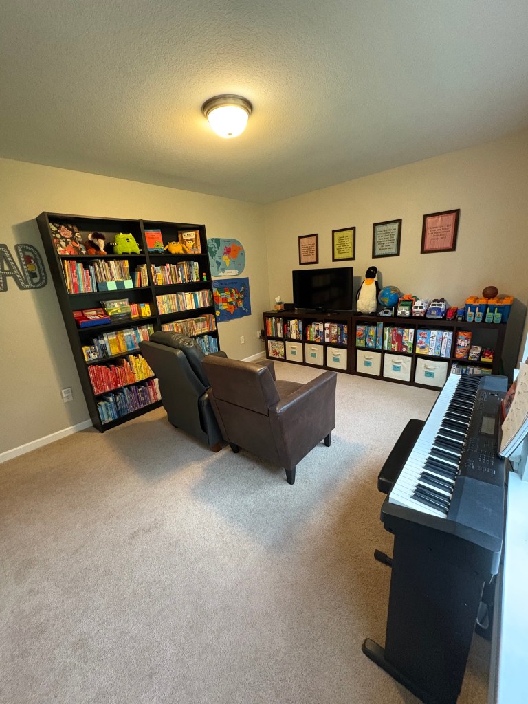 We moved a chair from Graham’s room into the playroom, which was the springboard for rearranging the playroom. Our old set-up didn’t leave enough walking space between the bookcases, two chairs, and the piano. Last week’s project was the bedrooms and this weekend’s project was the playroom. It feels so good to have them both tackled now. We took down some maps from the walls that the boys have outgrown. We now have some new wall space to decorate around the piano. We’re thinking music themed décor, but I have no actual idea what that is at the moment. I’ll have to keep my eyes open!