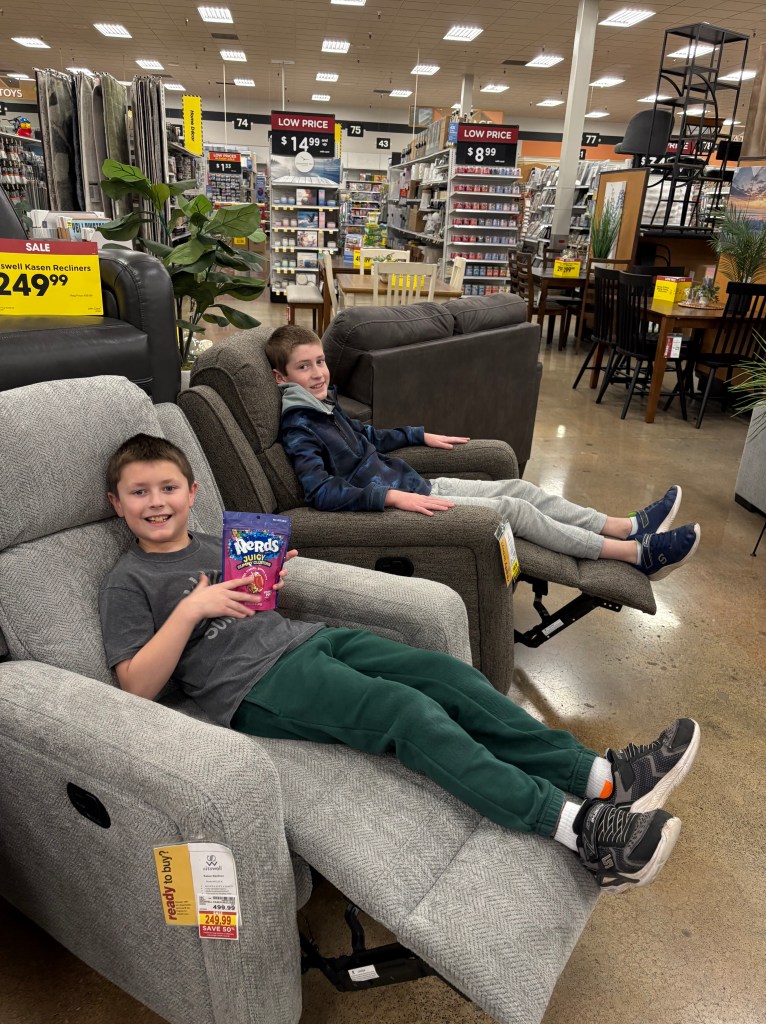 Family shopping adventures call for a moment of rest in Fred Meyer…
