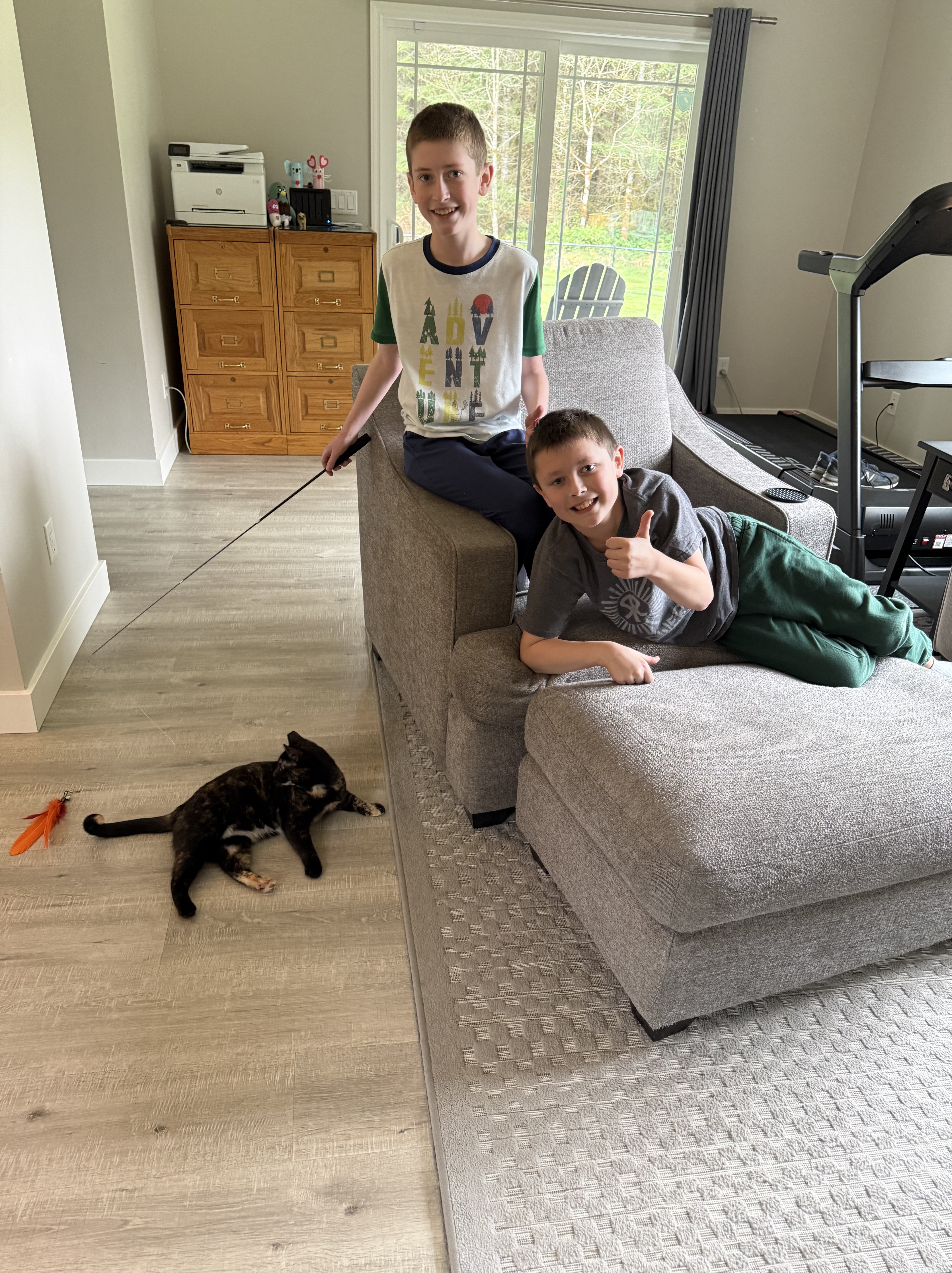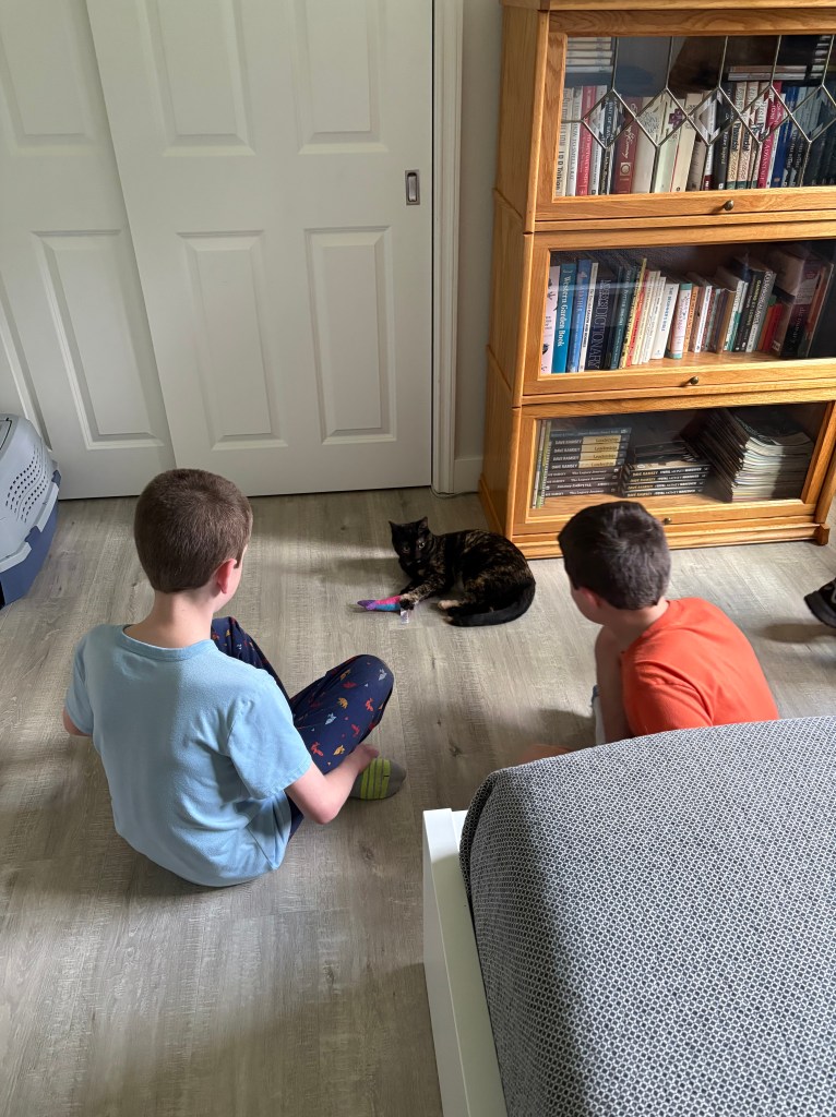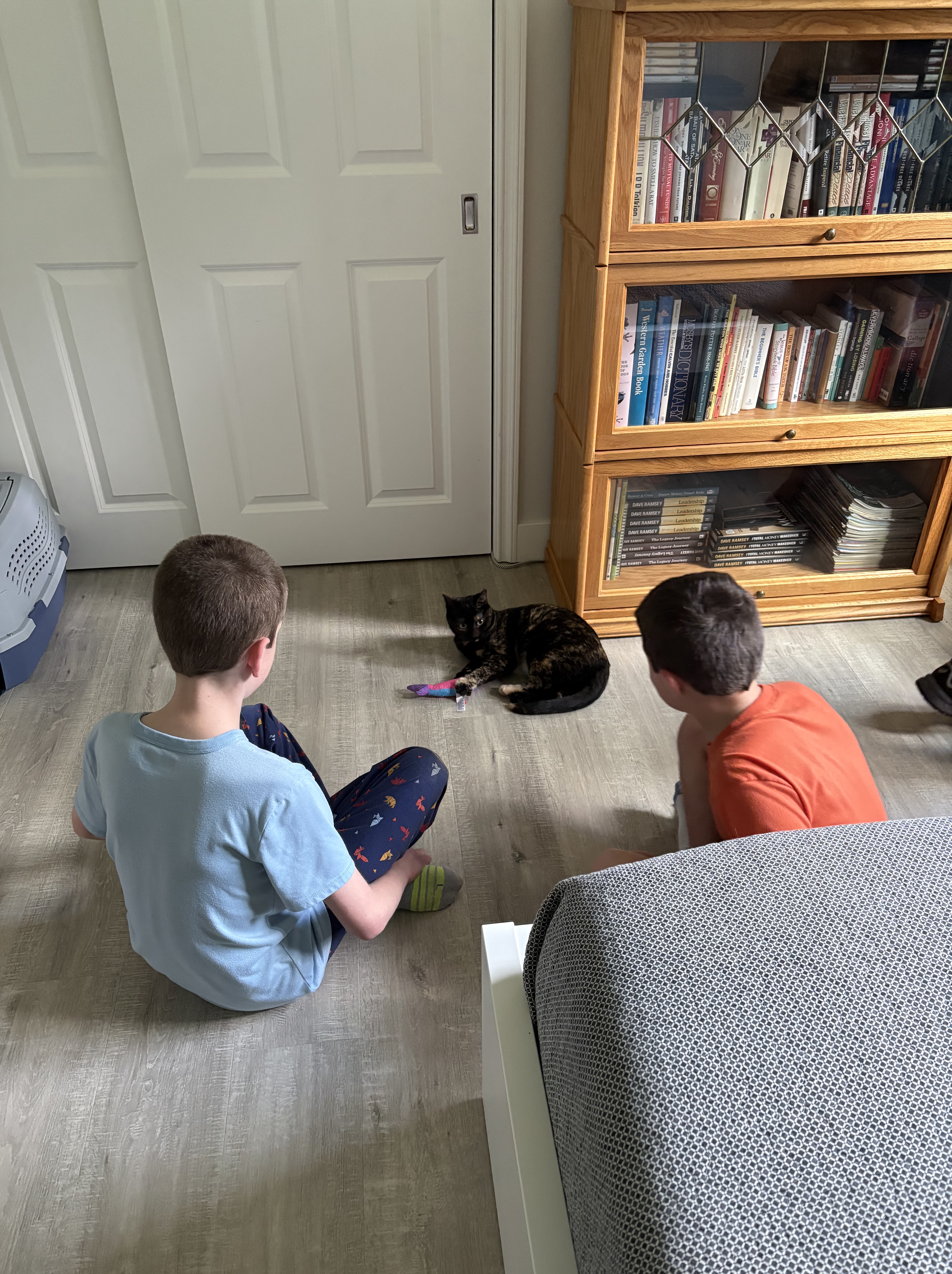 Finally, our last piece of news is a new cat has moved into the neighborhood! With heavy hearts, we said good-bye to TC, the doggie next door, in March. My parents decided they didn’t want to be a pet-less family, so they adopted Tipper this weekend. The boys are thrilled! They get to experience the joy of a pet vicariously through the neighbors. It’s a win-win! Bonding with Tipper is now their top priority. Good thing she’s playful and enjoys the attention the boys are showering on her. Tipper is exciting new addition to the family!