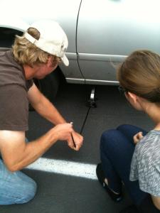 The sunny hours at the zoo turned into a cloudy late afternoon as we left and headed home. A little sunburned and a little tired, we arrived back at Bethel Church. My brothter-in-law, Andrew, met us there so the four of us could go to dinner. But first, we had an issue of a flat tire from the day before that needed to be dealt with. I walked April and Andrew back to the car to show them the tire and before long the three of us were changing the tire. I should mention that none of us had ever removed a tire or placed a spare tire on a car before. We found the equipment in the trunk, which I was happy to learn that all stuff was located back there! Once we had the tools, we need to the know how. Being tech savvy, I pulled up YouTube on my phone and started to watch videos about changing tires. The video helped a little, but we decided we needed the owner’s manual. Once the manual was out, we got down to business! We had the tire changed by the time Jeremy got done seeing all the kids off from the zoo trip!