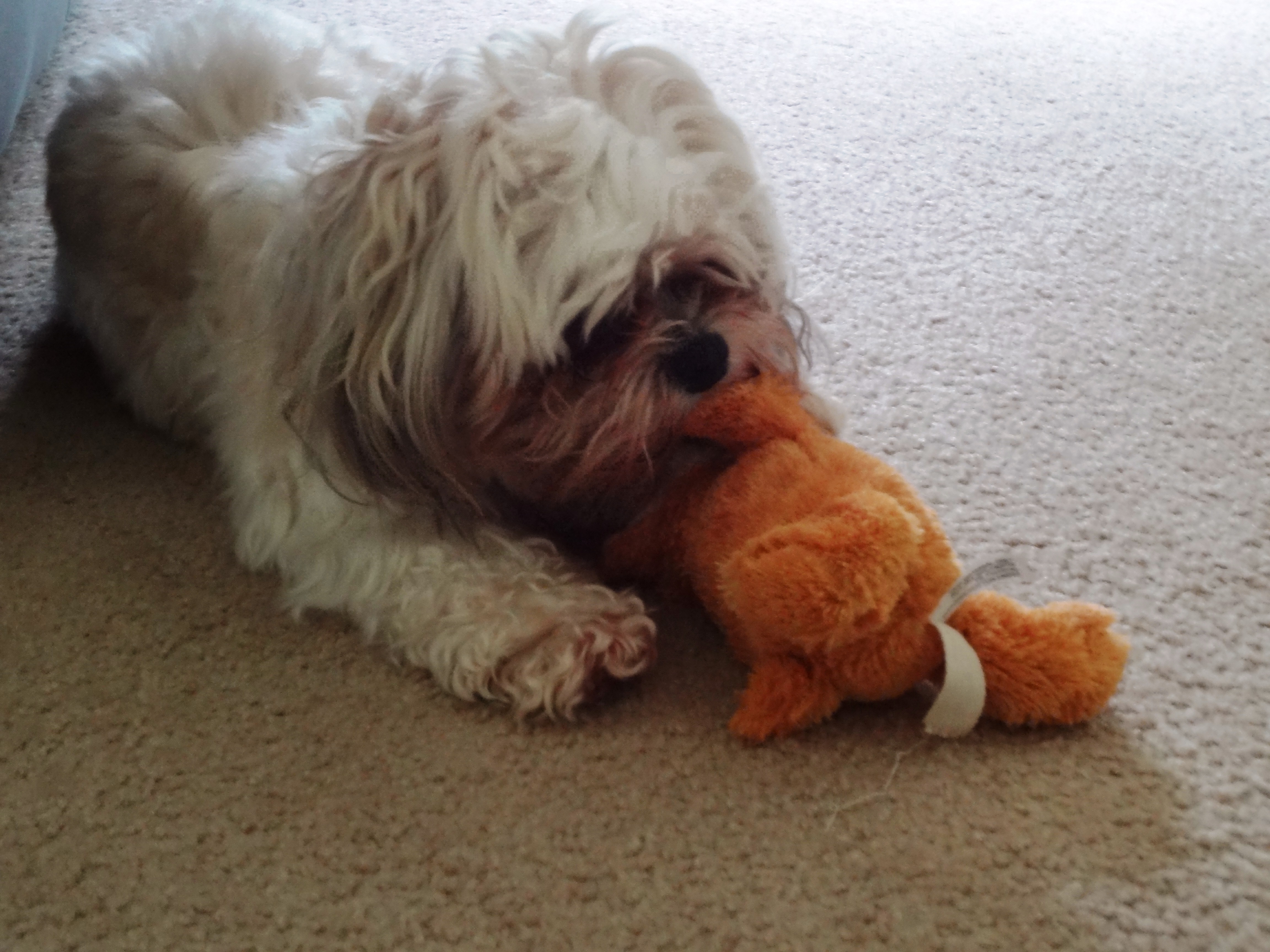 I decided that Toby and I both deserved a special treat on this quiet, gray morning. We purchased a four pack of dog toys from Costco ages ago and we’ve slowly been giving Toby a toy out of the pack. The problem about these toys is that they have stuffing. Toby loves to kill his toys and rip out the stuffing. Which means my floor becomes covered in toy fluff. However, I was feeling generous and I decided that I could handle the mess. So Toby was awarded a new toy to spend the morning killing. At this time, he has opted for looking at the sliding glass door just a few feet away from me. Maybe he is comforted by the gray, just as I am.