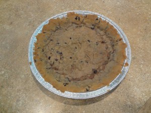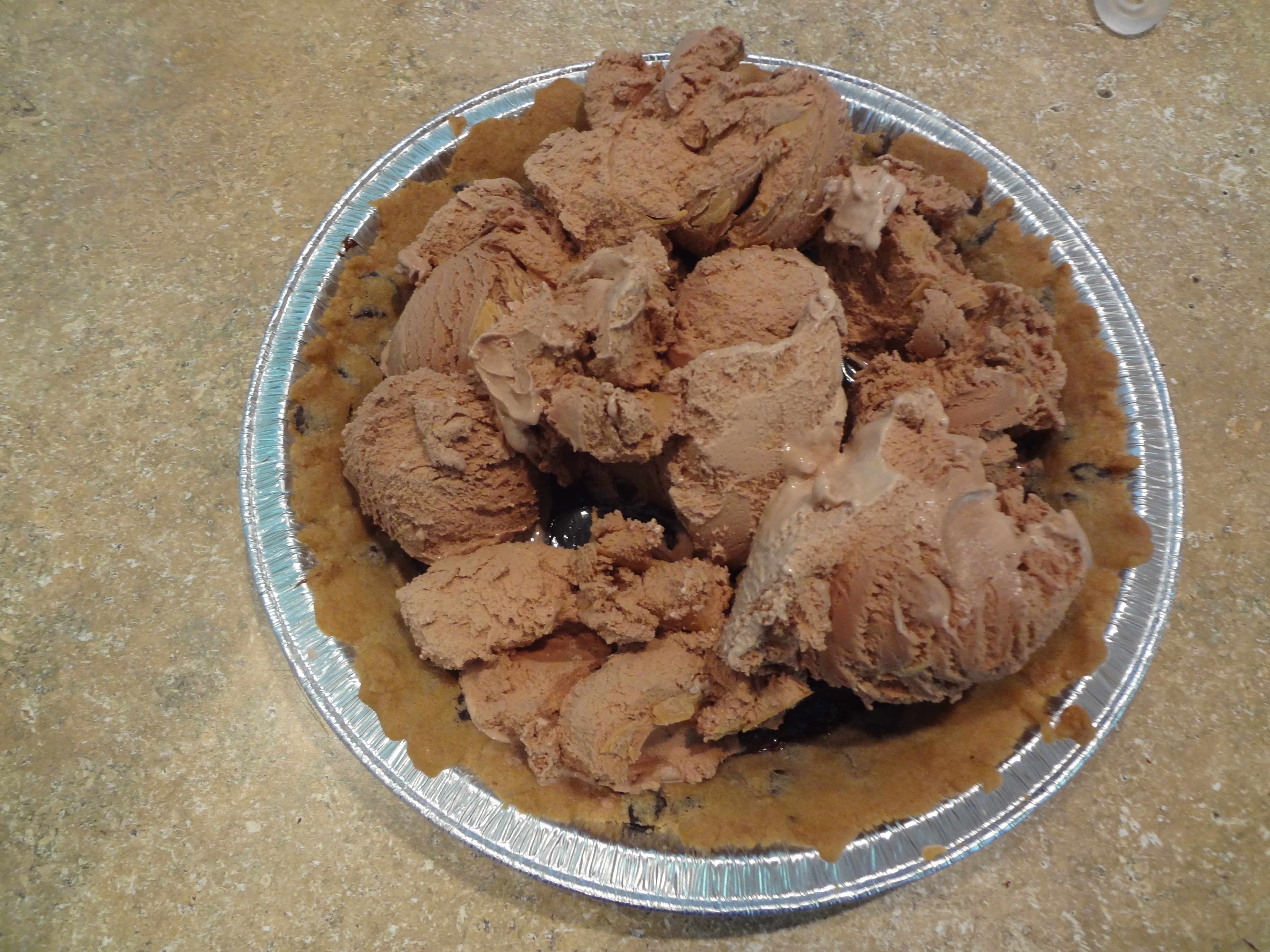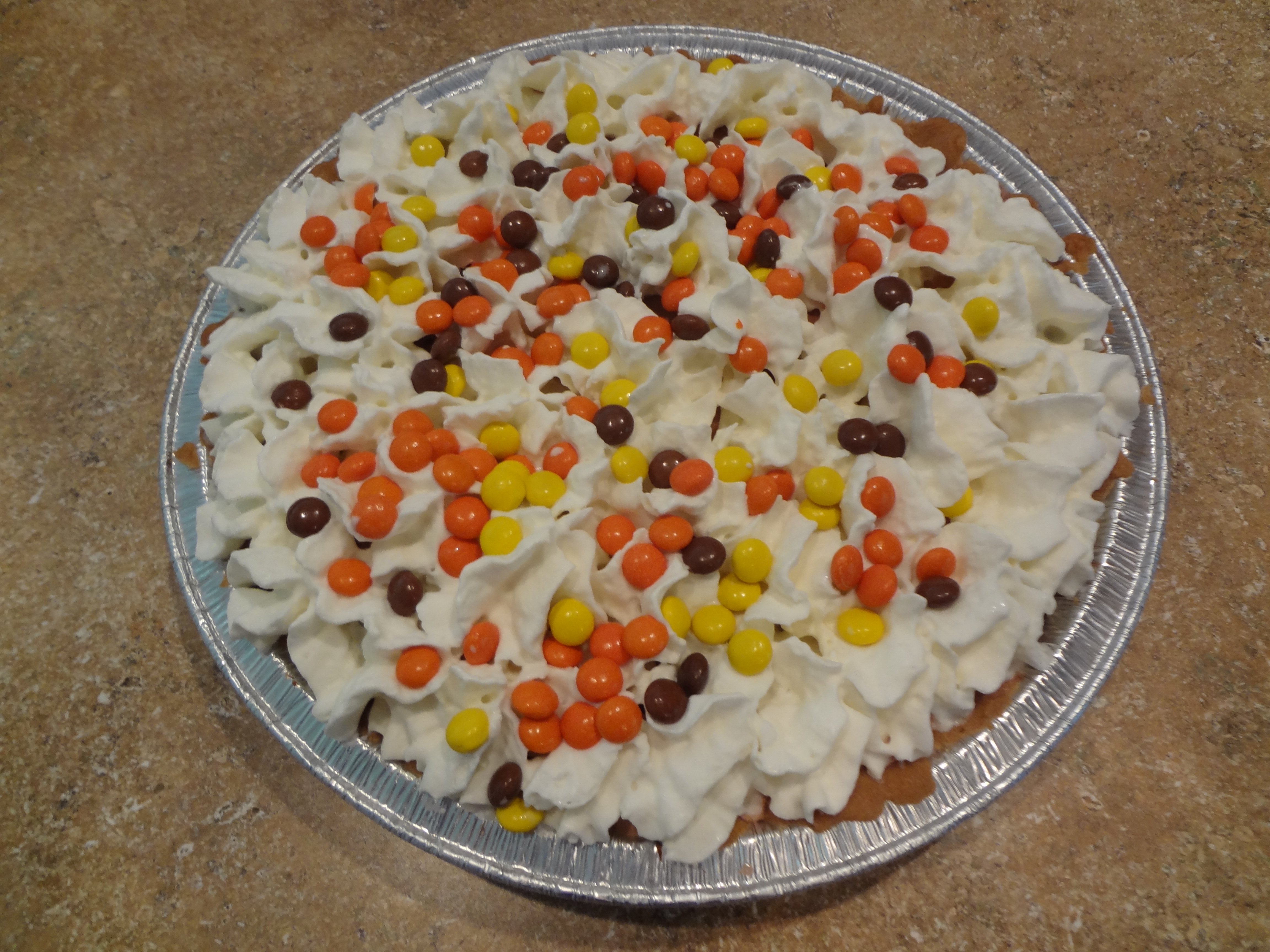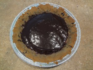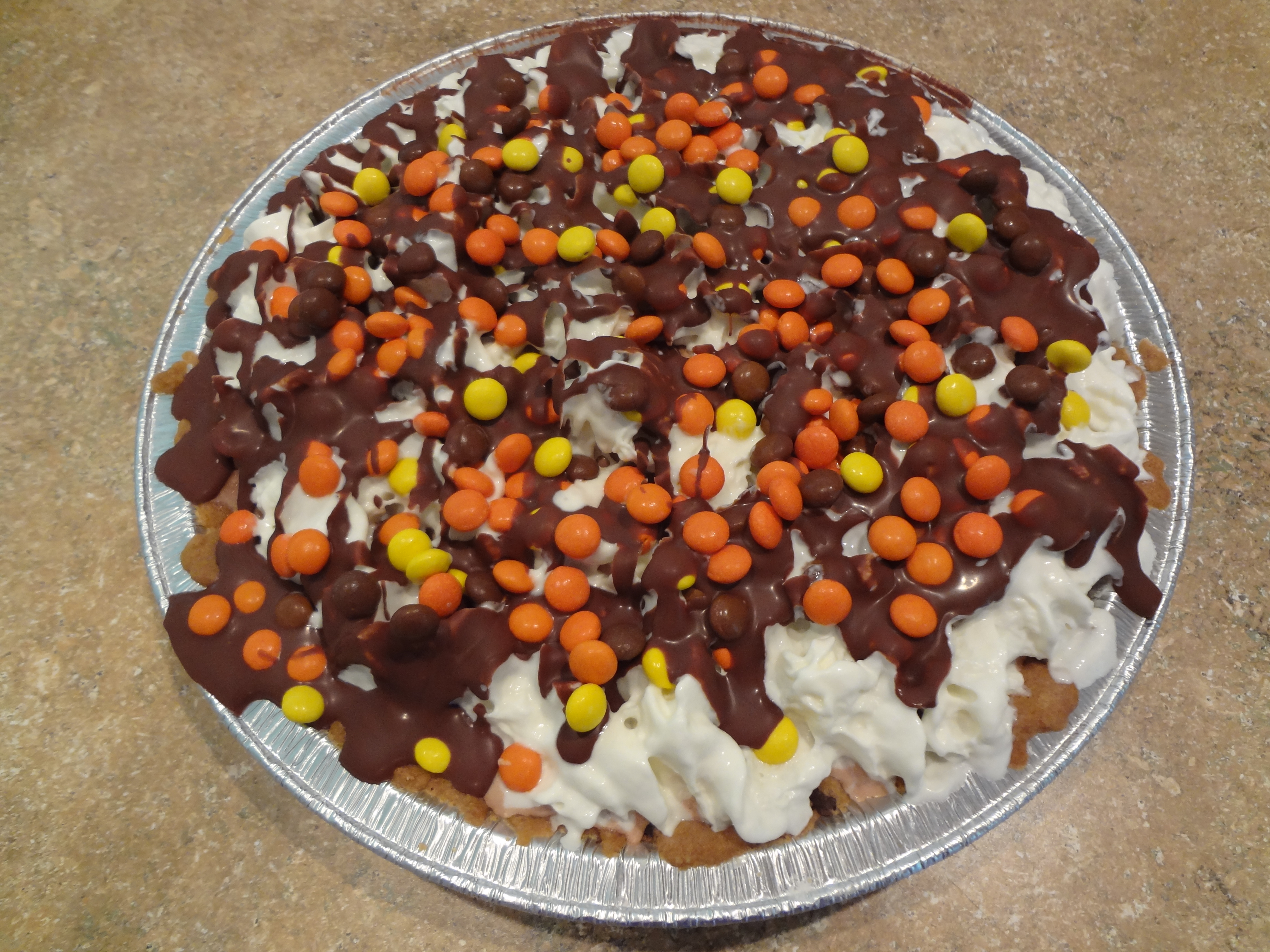 Earlier this week I saw a recipe for an ice cream pizza that I just had take a closer look at. After careful examination, I decided that it could use some improvement. First off, I don’t have a pizza pan, but the picture really looked like a pie, so I went with the pie inspiration. Also, fudge, vanilla ice cream and peanuts are nice, but I think we could take this up a notch by going with a chocolate peanut-butter theme. I’m not a huge fan on peanuts on the top of ice cream, so I decided on mini-sized Reese’s Pieces. Instead of more fudge on top, I used Reese’s hard shell. Noticing a theme? So here is a layer by layer shot of my dessert.