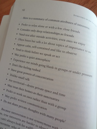 3. Wow I knew that I was an introvert, but just reading the list from the picture I check off for almost all of them! This sounds like a great book! I really appreciated what you said about introverts not always being behind the scenes in ministry. I have found myself frustrated at times by this. There have been several times when I have been given a behind the scenes role clearly because of the leader’s perception of what I would prefer. They thought exactly what you said, that I do not like being/speaking in front of people. I relate to what you said about small talk and the need to have quiet solitude too.