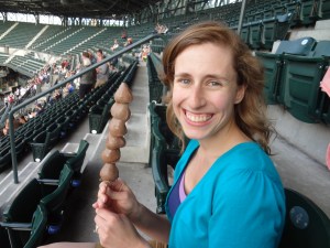 We still had some time until the game started, so we went on the search for game food. For me, there is nothing like a skewer of Shishkaberries! They are chocolate cover strawberries and they are heavenly! Seriously, I would pay the ticket price to get the berries and just head home! I don’t the kids would have agreed with me. With my berries happily in hand, we headed to our seats.