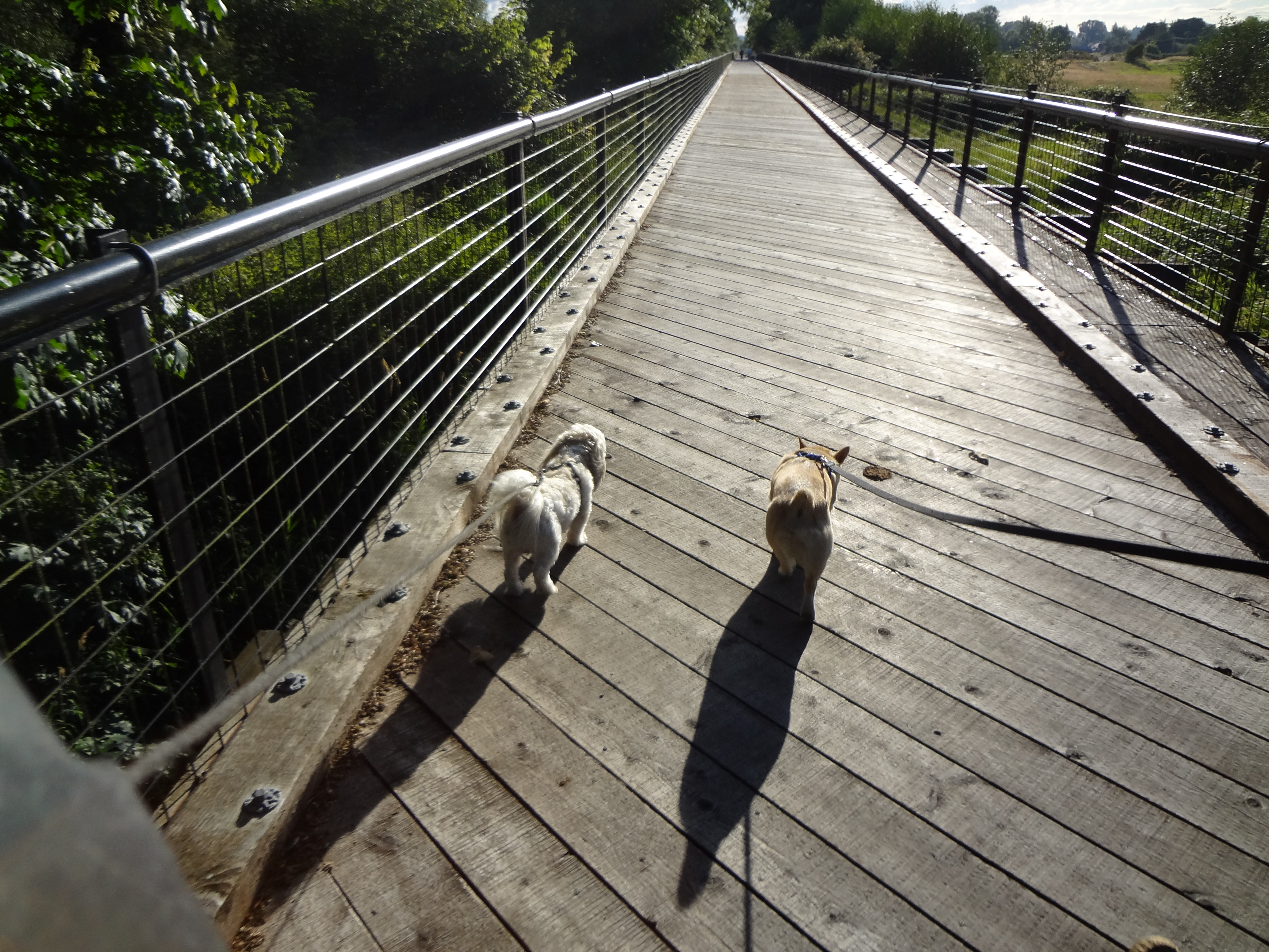 I will admit that I was a little nervous about how Toby and Todd would do all harnessed up and walking in the same direction. It turns out they did pretty well together. They sniffed stuff and tried to be the lead dog. However, I would say for the most part they were in their own zone and minded their own business. At one point, we passed a very well fed dachshund. Toby and Todd hadn’t a made a noise at anyone, but the dachshund was not shy and started to bark as we passed them, even though our doggies passed by silently. It was so strange, at the moment Toby and Todd became a team and the pack mentality kicked in. Suddenly they were side by side, sniffing each other and acting all interested in each other. It was so random, but they must have felt the need to join forces against the pudgy dachshund who had long past.