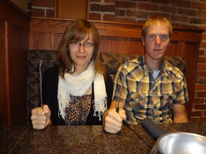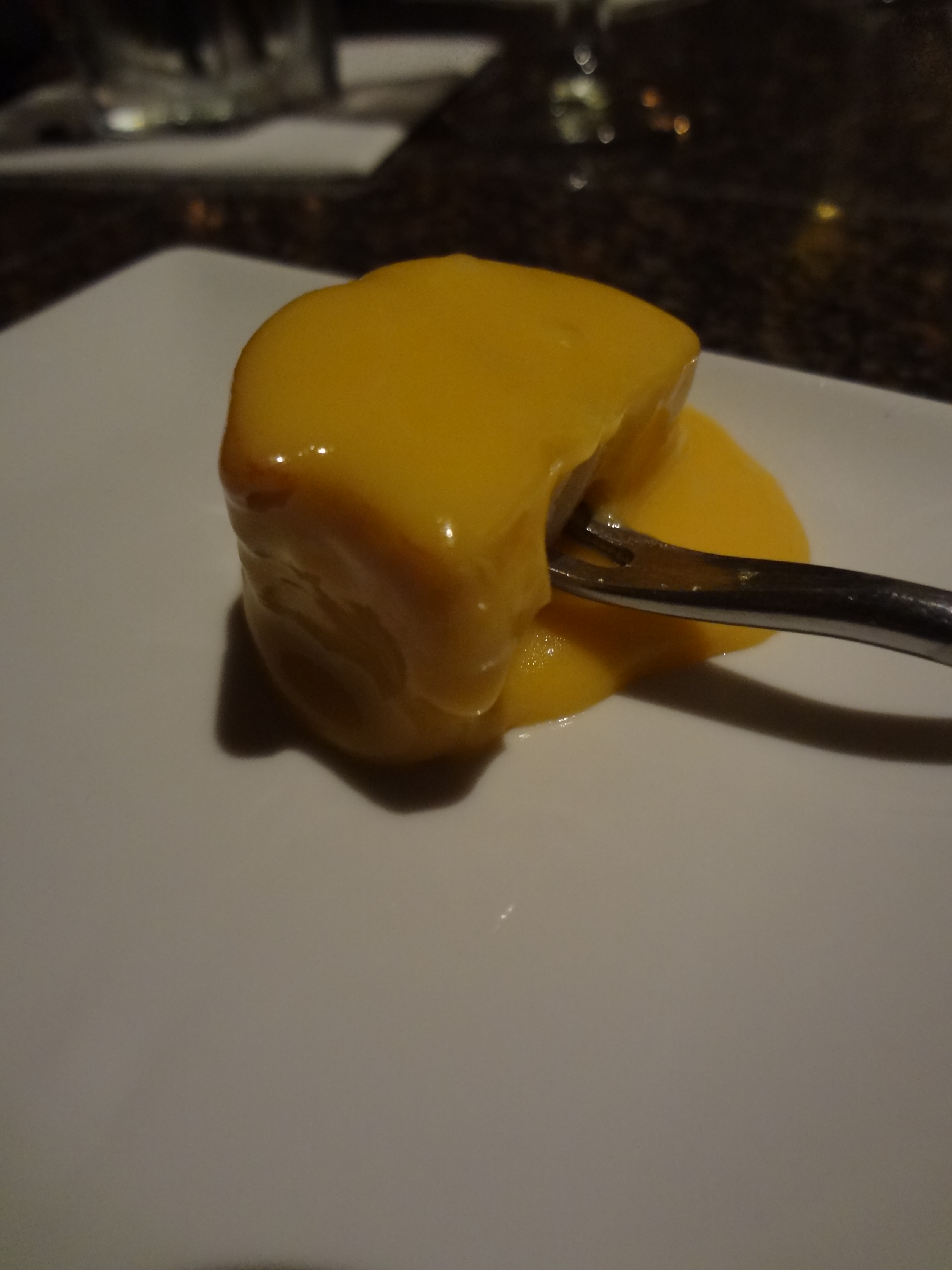 The food was amazing! As it should be! We had cheddar cheese fondue that we dipped bread, apples and veggies into… well, others dipped the veggies. I didn’t! Just being true my taste buds! The next course was salads. I had a yummy Caesar salad. Then it was on the next course which was cooking meats and pasta in a delicious boiling stock. I used my handy dandy new phone to time each item that went in. No need to poison myself with undercooked food. The final course was dessert – the best of all! We got what they call the Flaming Turtle which consisted of milk chocolate, caramel and candied pecans. They used some form of alcohol to light it all up on the table. Very impressive and tasty!