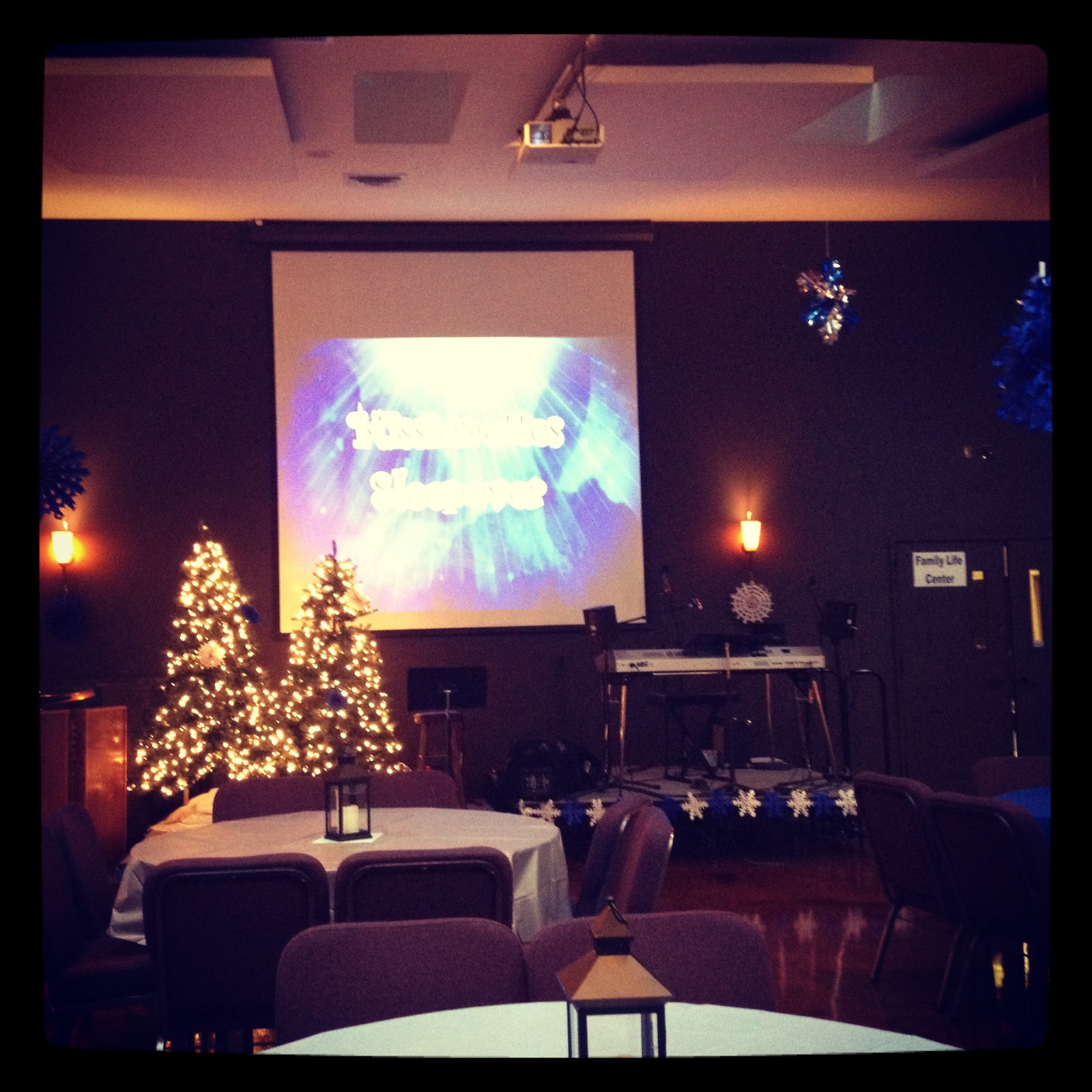 Decorating is a key part of any gathering because it sets the vibe and tone for the event. We had white Christmas lights on as they walked into our main meeting space. These were left up from the Valentine’s day dinner the day before, but once we hung snowflakes and blue and white paper lanterns from them, you’d never know they were a leftover decoration. Our main space had snowflakes hanging from ceiling. The tables were decorated with alternating blue, white and silver tablecloths. The centerpieces were lanterns with flickering flame-less candles inside. We had two Christmas trees on stage with more white lights. The bottom of the stage was outlined in snowflake garland. Our background screen welcomed the girls with a snowflake pattern looped giving it the effect that it was snowing in the room. I love the details that go into making a theme come to life!