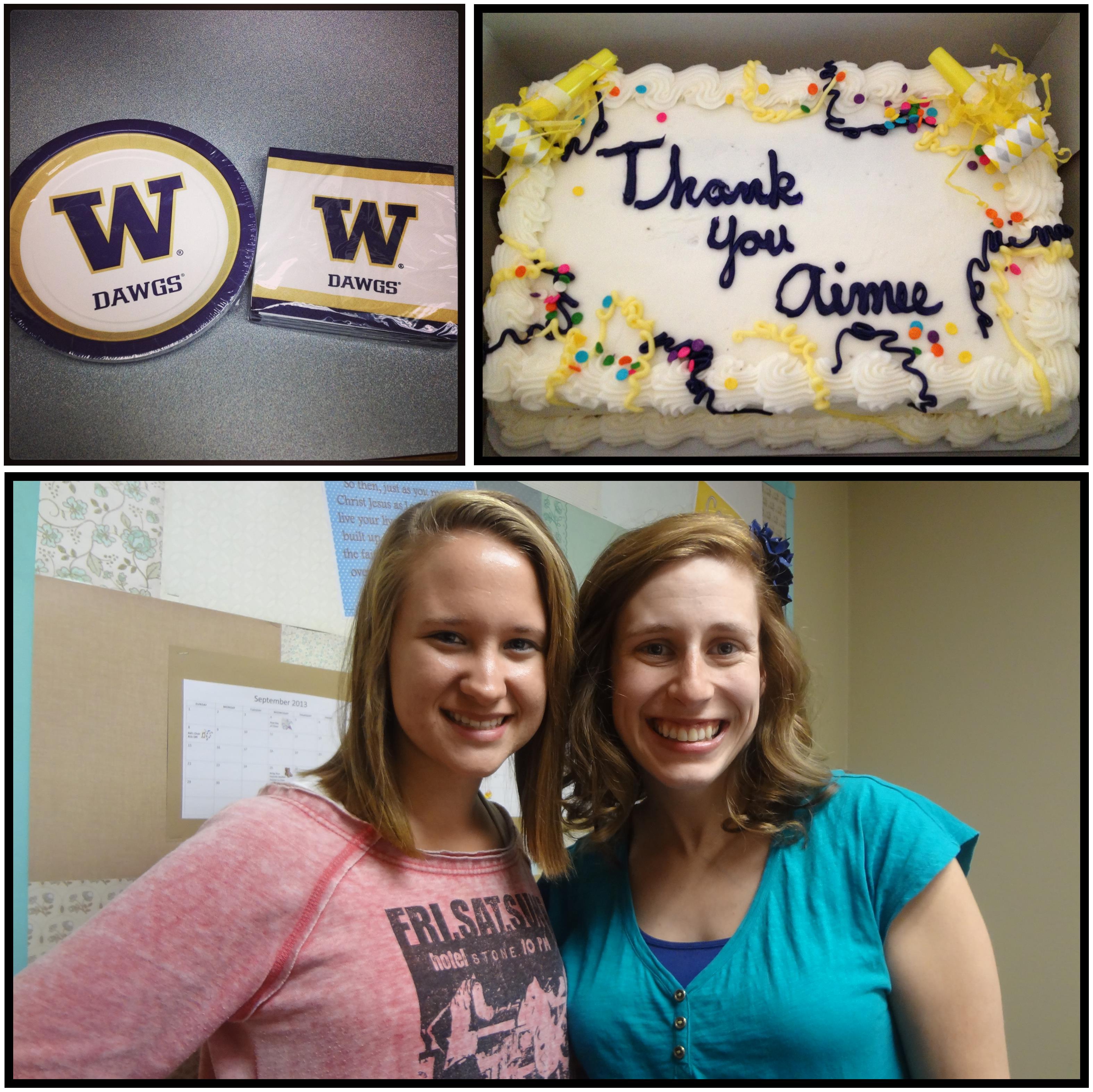 I’ve known all summer that my wonderful student helper of three years, Aimee, would be leaving for college at the end of the summer. Knowing it was coming didn’t keep me from denial. Somehow I was still caught off guard by Aimee’s last night! Oh, last night… Just writing that makes me sad. The last two weeks of August, my class visits our student ministry, Fusion, to see what their transition in the fall will be like. I, however, had us sneak out early so I could surprise Aimee with a cake in University of Washington colors. I even got UW plates and napkins! It was great to celebrate Aimee and her three years of influencing young lives. It was fun go with the UW theme and I think she appreciated it. She took the plates and napkins with home her! We took one last group picture as a class and the end of a season officially happened… Insert tears here! I got my own picture with her, I walked her to the front doors and hugged her at least 3 times in 15 minutes.