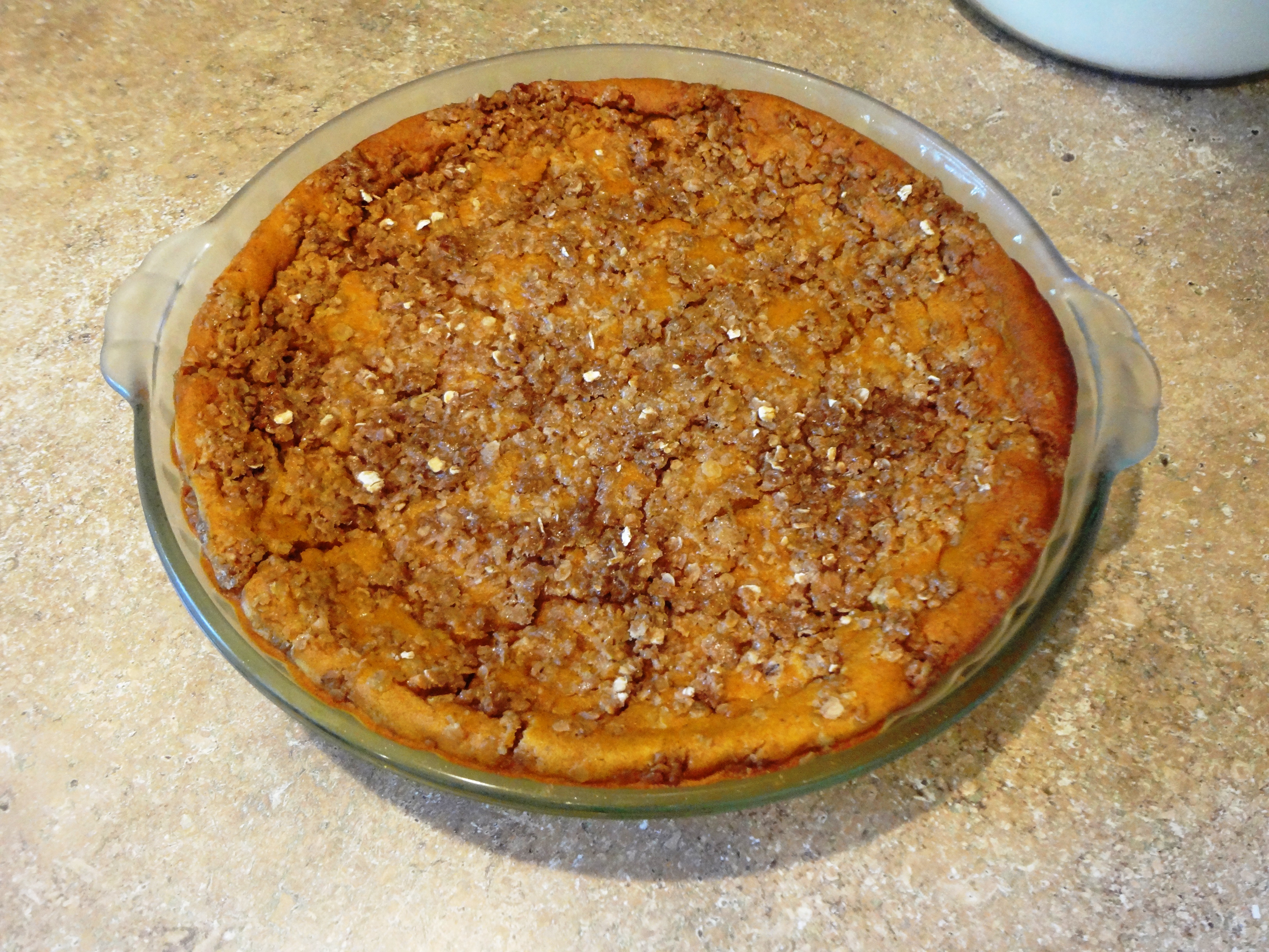 I had purchased all I need to make a classic pumpkin pie, but once I got into the kitchen I decided I wanted to do something different. I went through some recipes and compared them to the supplies I had ready and on hand. In the end, I decided on a crustless pumpkin pie. A lot of factors went into this decision. The main reason would be laziness. I didn’t want to make a crust, bake it and then add the filling. The next reason was the crustless pie recipe I chose had a brown sugar-oatmeal crumble on top and that sounded good.