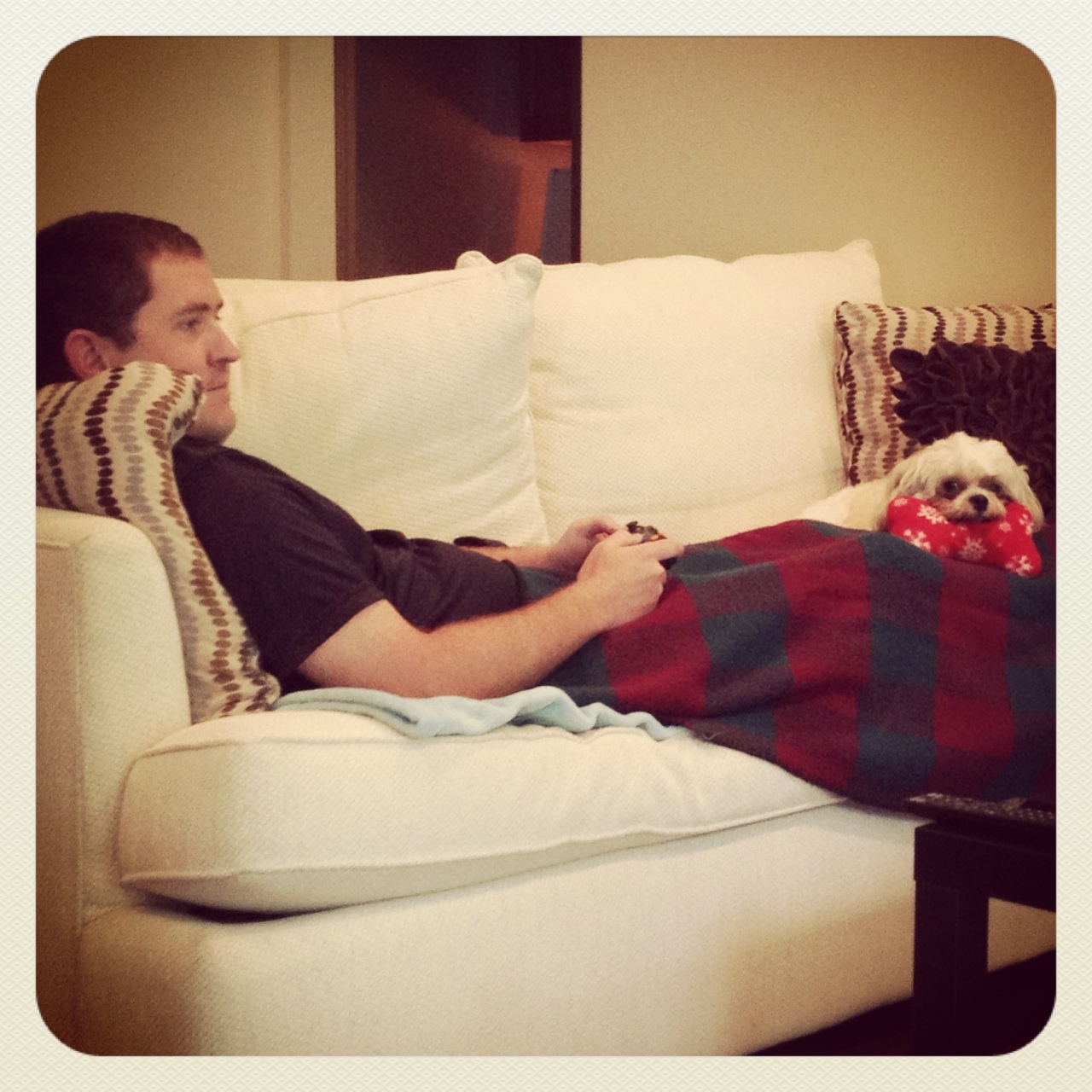 Today, however, has been a different day. The rain started off steady, but that wasn’t surprising after the amount we’ve seen lately. At one point, we had over 3 inches of rain fall in 24 hours. Pretty impressive. Jeremy had a later start, but still decided to go out hunting this morning. Toby and I tidied around the house, did some laundry and settled in for a day of reading and resting. On days like this my hubby comes home for a mid-day hunting break. I always love seeing him during hunting season because each time he is here and not in the woods feels like a treat. The hubby, doggie and I settled in for a quiet afternoon. Jeremy played video games and caught up on TV shows. I read more and took a nap. Toby pretty much slept and played with his toys. There was a contentment in our house. It was really a lovely way to spend a lazy day off. Well, lazy for me. Jeremy did put in a bit of walking this morning in the woods and now he is back out and at it again. Since Jeremy is gone, Toby is once again my buddy (I’m not as interesting when Jeremy is home and the dog flocks to him). We’ve made some dinner, finished a good book and now he sits by my side as I blog.