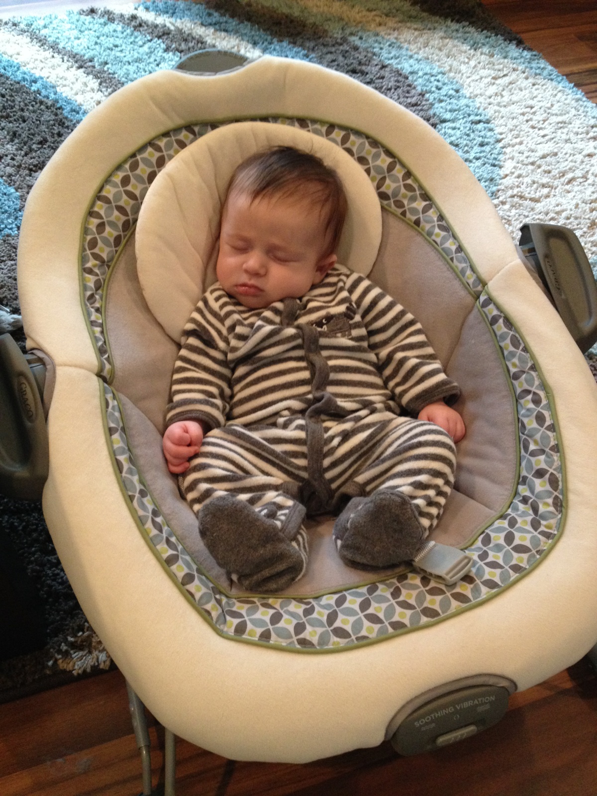 To start the transition to sleeping in his room, I put Owen down for his morning nap in his crib for the first time today. It took a lot of coaxing to get him down and he only stayed asleep for about a half hour. A little later towards lunch time, I tired again. Once more, he made it about a half hour. My thinking is that Owen is used to sleeping the living room and he can see me when he goes in and out of sleep. I’m guessing he gets upset when he wakes up and no one is there with him. I was about to do a third attempt of nap time in the crib, but Jeremy surprised me a quick stop at home to pick up some supplies for tonight. I was just about to enter the nursery when my dog alarm went off (thanks Toby) and Owen’s eyes opened. He gave me that look like “Seriously, you’re putting me in here again.” So, I turned around and Jeremy got a few snuggles in before having to leave. Since Owen was now awake and the super sleepiness had worn off, I caved and put him back in the bouncer – where he is now napping. I’ll try my efforts again tomorrow.