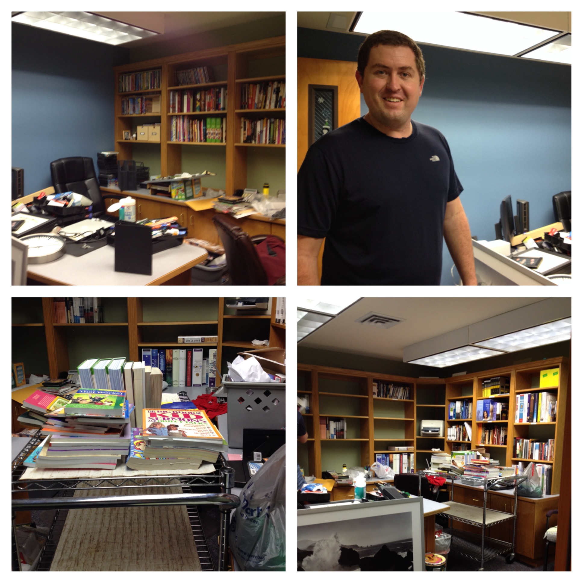Monday night our little family camped out at the church for the evening. I brought the boppy and Owen’s bouncer. All the comforts of home. We set about making an office switch. The thermostat in our back offices is a bit odd. Jeremy’s office runs about 78-80 degrees most of the time. Since my hubby can sweat in the arctic and it seems that Owen has inherited that trait, it’s just too warm for them. The solution was switching to a cooler office. The great thing about moves is that they force you to examine your stuff. My hubby has been in that space for a long time and had accumulated a lot. I was impressed with how much he paired down and he still has plans to get rid of more. The big challenge of the office was move was swapping two full offices. We would empty one shelf from one office and move it the same shelf in the other office. There was a lot of back and forth. We wanted to make sure when moved the other office, we didn’t mess up anything for the staff members that use that office. We tried to make things as identical as possible and as workable for them. We prioritized them and left our new space a bit of a mess. When you’re working with a baby in tow, we knew we couldn’t complete both offices in one night. After 4 hours of switching, we had to take Owen home and put him to bed. He was a great baby throughout the night. We moved him all around, trying to keep the view exciting and interesting. He also took a couple of good naps. Jeremy and I were really proud of him. I will admit that there was a sad moment when we shut the door on what is now “Jeremy’s old office”. He had been in that office longer than we’ve been married. I remember when he moved in there. A lot of moments have happened in that office. Working alongside Jeremy has been such a blessing. I know that we will make new memories in our new space, but I can’t help but feel a little nostalgic about our old one. It will always hold a special place in my heart.