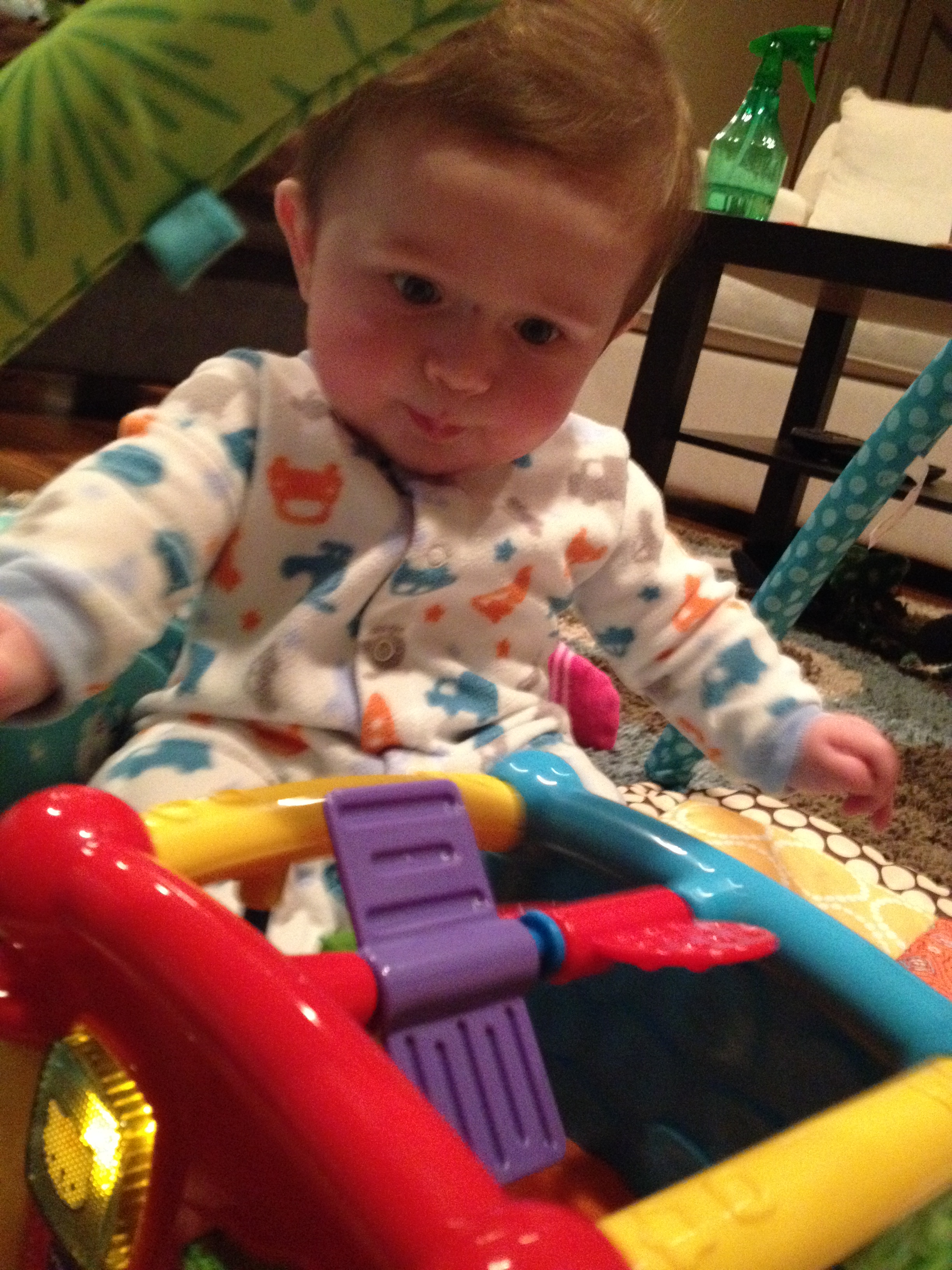 It’s fun to listen to Owen babble now. He really likes saying “a-da”. He is well on his way to saying “Da da”. Jeremy should be thrilled about that. While, I’m sure he didn’t mean to, I’m positive that Owen said “no” this last week! Jeremy heard him say something close to “hi” this weekend. It will be fun to see his vocabulary develop soon.