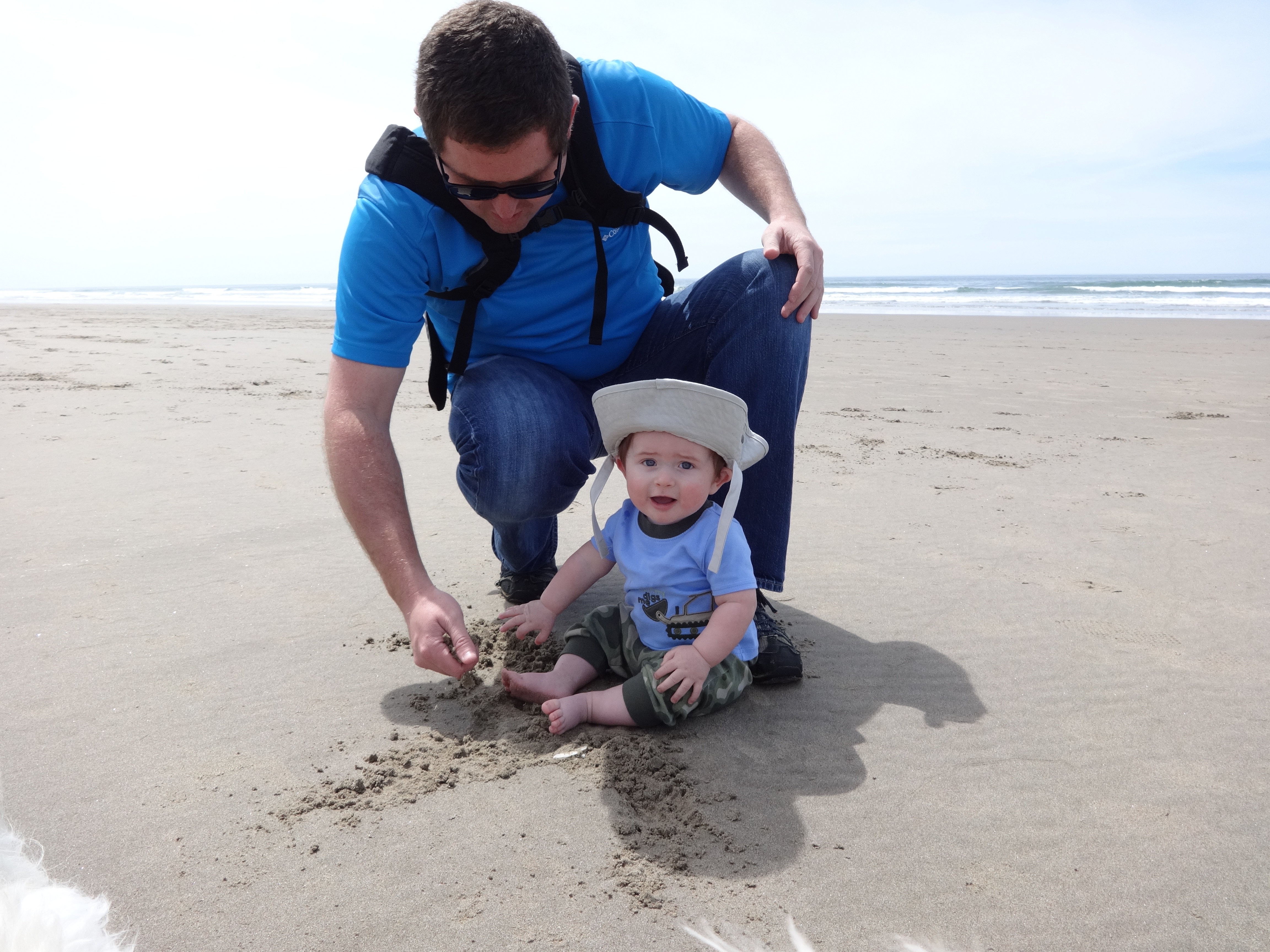 Jeremy took Monday off since he has been working some of his normal Fridays off. In true Jeremy fashion, he asked me spur of the moment if we’d like to go to the beach. We’ve been talking about going to the beach for a while but just hadn’t set a date. Since Monday was a free day and the weather was amazing, it seemed like the perfect day to go. Owen was a super napper the entire way there and back. Once we arrived in Cannon Beach, we unloaded our crew from the car and Jeremy set about getting us lunch from our favorite restaurant. Toby was along for this adventure so we couldn’t eat inside any where. It was too warm of a day to leave a dog in the car. In fact, it was a lot warmer at the beach than we expected! It was in the 80’s and surprisingly not breezy. It was perfect weather from walking on the sand by the water. After our meal of Mo’s to-go, we loaded up Owen and Toby and hit the beach. I’m fairly positive we spent more time getting ready for the beach and cleaning up after the beach than we did at the beach, but oh well. That’s what happens when you have a baby and a dog covered in sand. Owen took in all the sights, sounds and smells. Jeremy set him down in the sand and Owen grabbed a fist full of it. Jeremy even buried Owen’s toes in the sand! It wouldn’t be a true first visit to ocean without touching the water, so we put Owen’s feet in the very shallow part where the waves just barely come in. This first trip to the beach was a big experiment. I learned a lot. I will pack differently next time and remember the sunscreen. Since all Owen had was a sun hat, I was super nervous about him getting sun burned. Because I thought it was going to be cooler, I packed a lot clothes that Owen didn’t need. Overall, it was a success and good learning experience. We ended our time at Cannon Beach with a stop by the bakery. We drove out of town munching on doughnuts! What a good day!