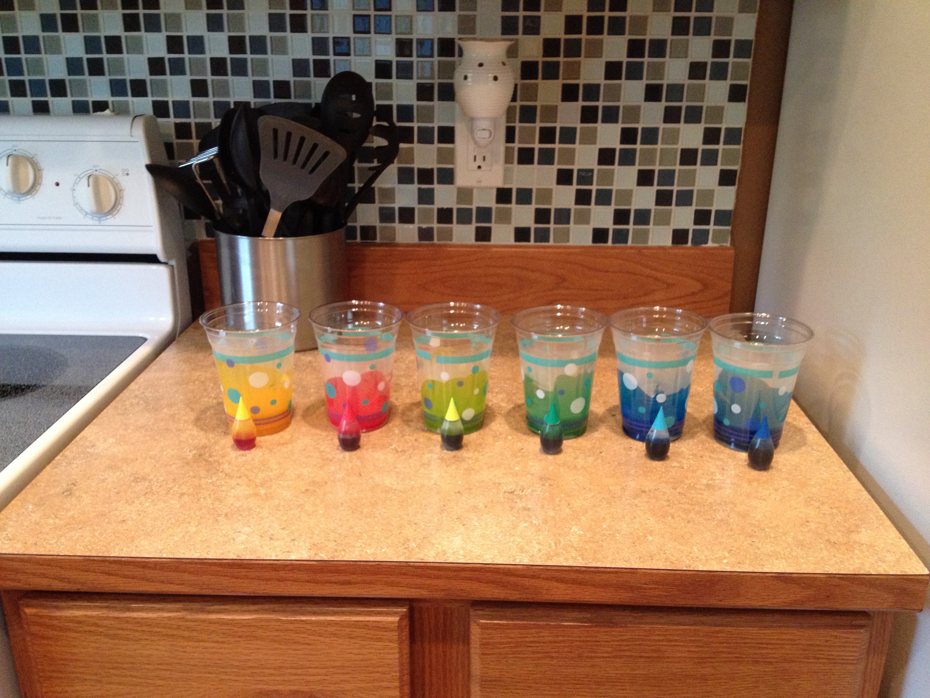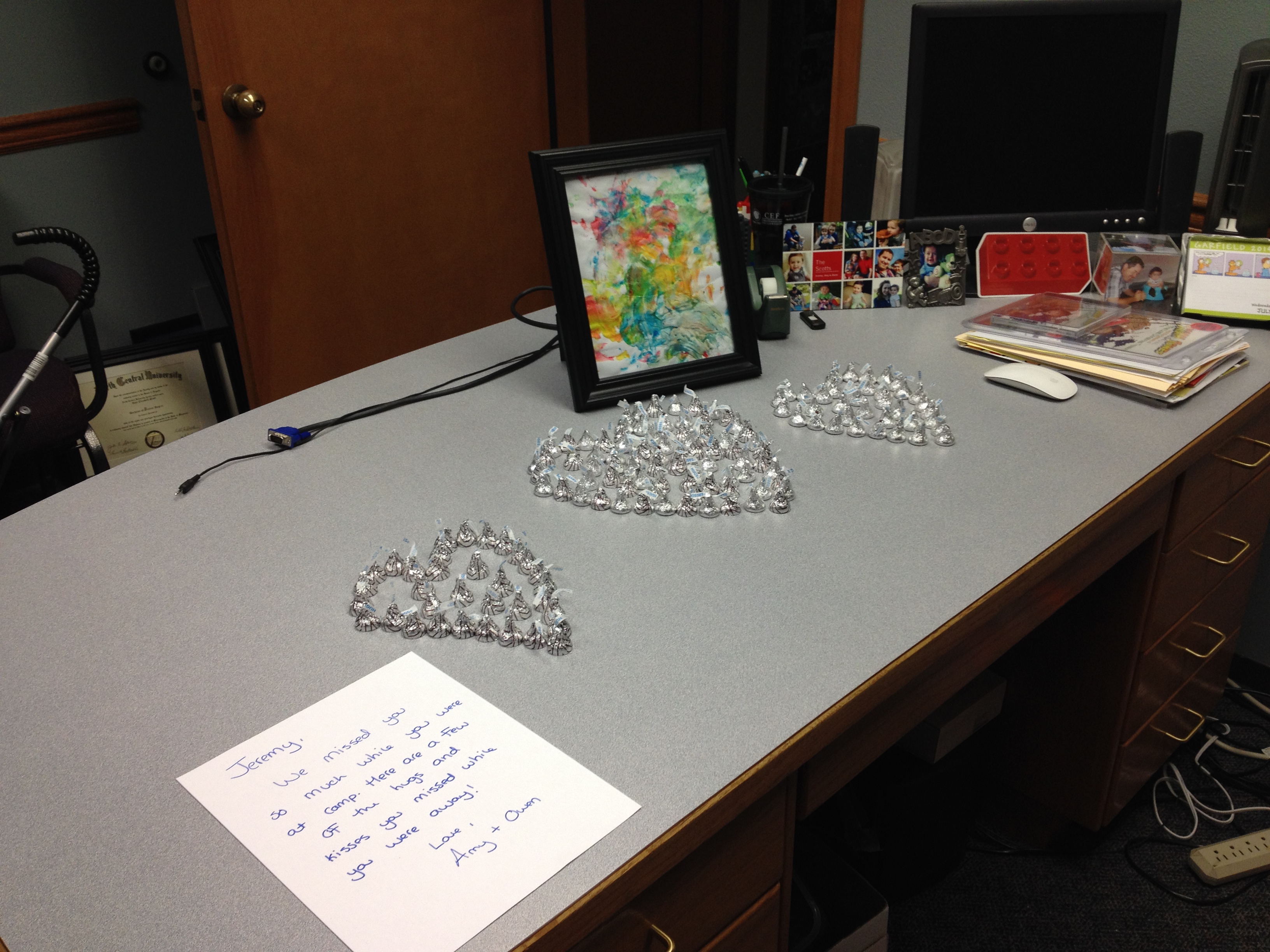 While, Jeremy was away at camp last week, I wanted to do an art project with Owen. I thought it would be super cute to have Jeremy come into his office and find a one-of-a-kind piece of artwork made with love by his son. I had heard of moms doing finger-painting with their babies. I thought it would worth a shot. My original plan was buy finger-paint, but then I got trapped in a classic “mom” dilemma. Even if finger-paint is non-toxic, what would happen if Owen ate some? Would a responsible mom really let her baby be exposed to those chemicals even if they weren’t toxic? I got worried about killing my kid and judgement from other parents, so I looked for another option and decided to do edible finger-paint made at home with safe ingredients. After googling a couple recipes, I settled on one that was made with flour, sugar and water (because I had all of these ready on hand). I combined the ingredients and whisked them on the stove top until they thickened. I then poured the paint into different cups and used a variety of food colors. Of course, the paint needed to cool before use and I wasn’t planning on doing the paint project the same day I made the paint, so I threw it into the fridge thinking that would keep it from going bad (if that is possible? I don’t really know). The paint thickened up even more in the fridge. When I pulled it out the following day it was a lot like pudding with a skin on the top. Lucky for me, I stirred it up and it was perfect. I used paper plates to pour the paint on. I laid a blanket down on our kitchen floor and dipped Owen’s hands into the paint colors individually. Adding Owen to the mix created some drama in a project that was going smooth up to that point. It turns out that Owen didn’t want to play with the paint. He had no clue why I wanted him to put his hands on the paper. I envisioned him making a merry mess and creating multiple pieces of artwork. I got one page done. That was it. I was concerned that the food coloring would stain Owen and the blanket, but it remarkably came out of everything. Owen promptly got a bath and the blanket got washed. No harm done. While the painting project dried, I ran some errands and got Owen some of the Crayola first markers and crayons. I thought that might be more his pace in the art department. It turns out, Owen isn’t interested in making art at all. He wanted to lick the crayons and markers. Again, he had no idea why I wanted to mark up the paper. It just didn’t click. Oh well. I now have some art supplies for him when he gets a bit older. I also really enjoyed the process of making my own finger-paint and it is a project that I wouldn’t mind doing again in the future. The project gave me something to do while Jeremy was away and I liked being able to do something that let Jeremy know we were thinking of him. I framed the artwork and put it on Jeremy’s desk with a bunch of Hershey’s hugs and kisses as a welcome home gift. Overall, it was a fun experience for me. Good thing Owen is too young to remember this escapade!
