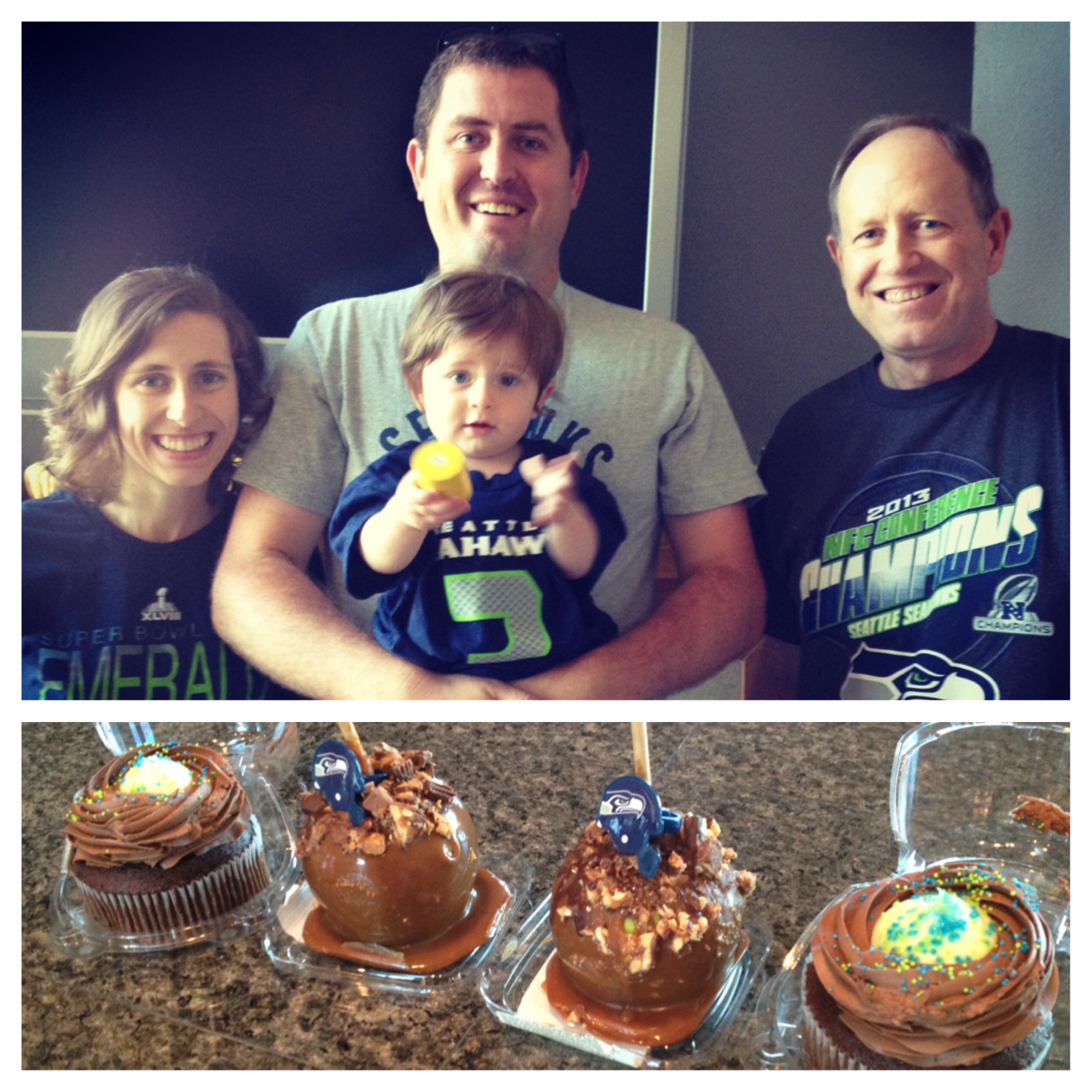 This last week was the beginning of football season. Usually football season wouldn’t be blog worthy, but now that the Seahawks have won the Super Bowl, the whole northwest is a bit crazy about them. I was gifted a Seahawks shirt this last week and I was informed that I should wear it on Thursday for the big game. I did because I love my hubby (who suggested it). I felt a bit silly wearing Seahawks gear when I’m really not a fan of football. Jeremy decided it would be fun to watch the game on my dad’s ginormous television, so we headed out to my parent’s house. We snapped a quick photo of all us in our gear and then the boys headed upstairs. Mom and I watched different documentaries on Netflix and Owen went back and forth between the two groups. Our local Safeway had Seahawks themed desserts, so we enjoyed some extra special treats. I have a feeling our household is going to be following the season closer than ever before. Oh goody.