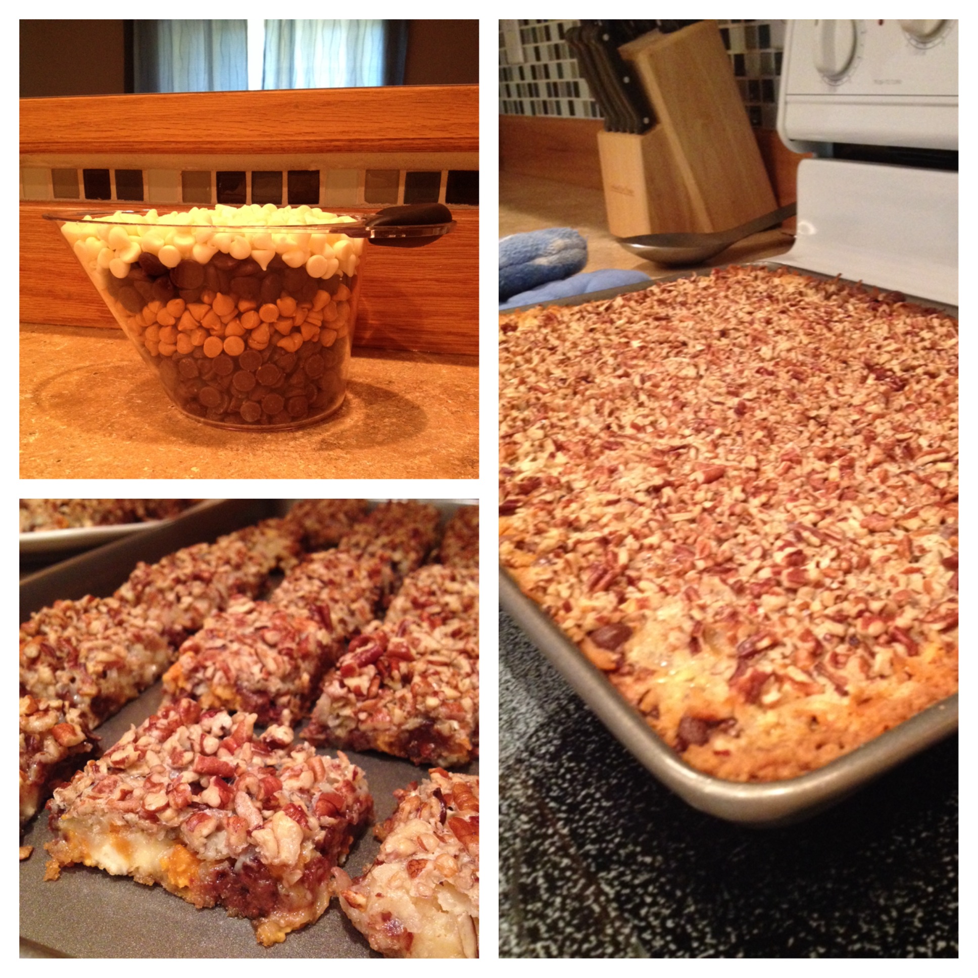 Both Jeremy and my mom are harvesting their mini-pumkins and I have four little beauties on my wood stove. They are eagerly awaiting the company of more pumpkin buddies! I know it sounds crazy, but I’ve already had a slice (or two) of pumpkin pie this season. My mom was the one who bought it, so I blame her! Last night, I felt up to doing some baking so I made a fall favorite for Jeremy and I – Hello Dollies. They are now cut into bars and placed in the freezer. Jeremy prefers to eat them frozen. I will eat them at most any temperature!