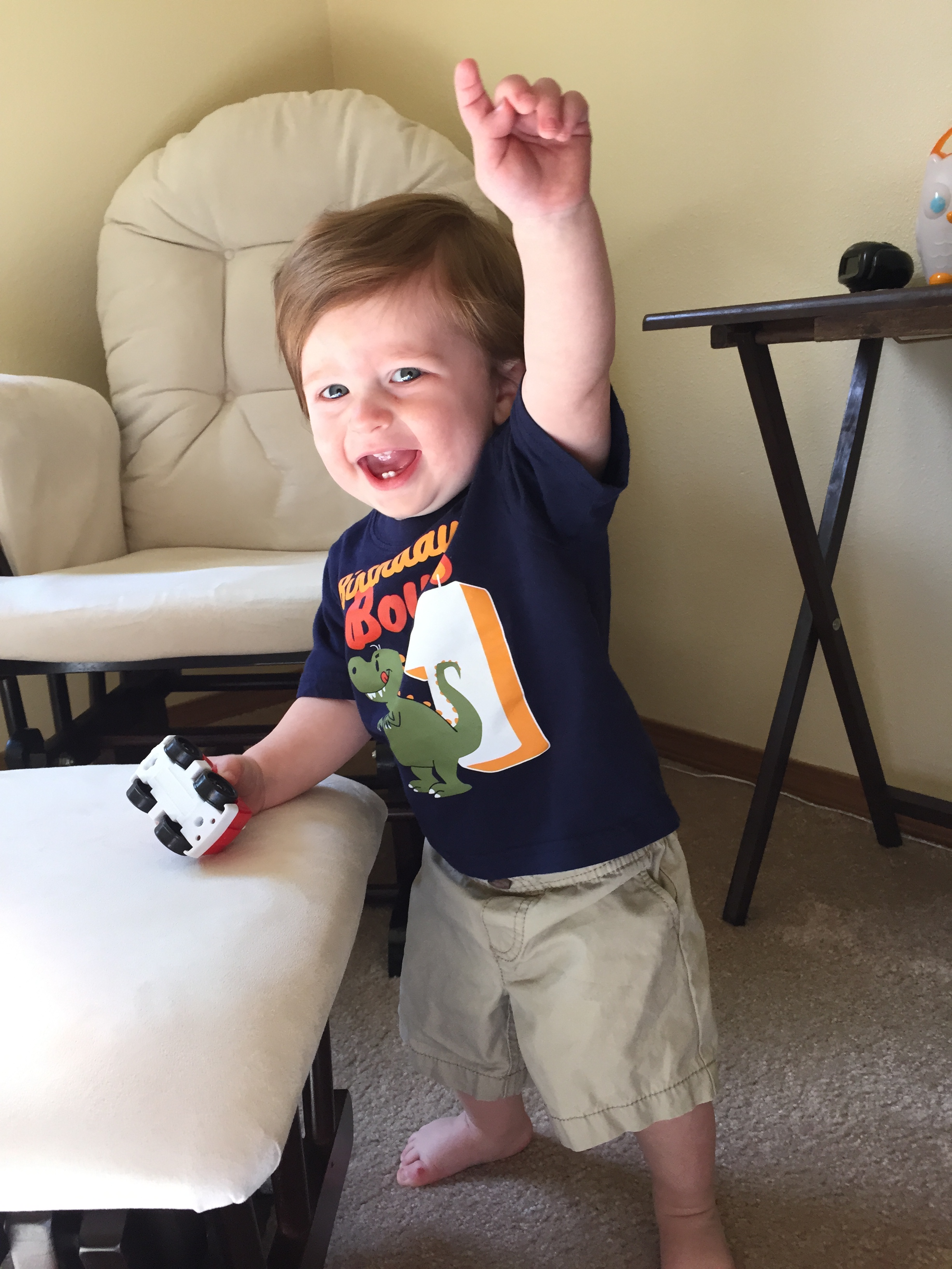 In what feels like a flash, here we are on Owen’s first birthday! Oh my! We celebrated his birthday this weekend with two parties and over the course of the weekend, I was feeling good because he wasn’t one yet. Officially. We were celebrating, but he was still my baby. But now he is one. I have mixed emotions about the big milestone birthday. Mostly, I am grateful that he has survived us and we have survived him. He has changed so much in the last month, he really is a toddler now. Mainly because he is officially toddling. He is walking and has been pretty steady on his feet for about a week. I had guessed that he would walk before his first birthday and he proved my hunch right. I’m a little sad that he has entered into a new phase. The baby phase felt too short. However, this is an exciting time as Owen learns new things. Walking was a huge accomplishment. I have a feeling his vocabulary is about to take off. Currently, Owen can say Mama, Dada and up. He is getting very good at saying things back to me though. I have heard words like out and bop and pop. Of course there are lots of other jabbery words he says. I’m thinking they might soon make a little more sense. In the back of my mind, I keep telling myself he is still a baby because he can’t talk back at me yet. I keep finding reasons to keep him a “baby”.