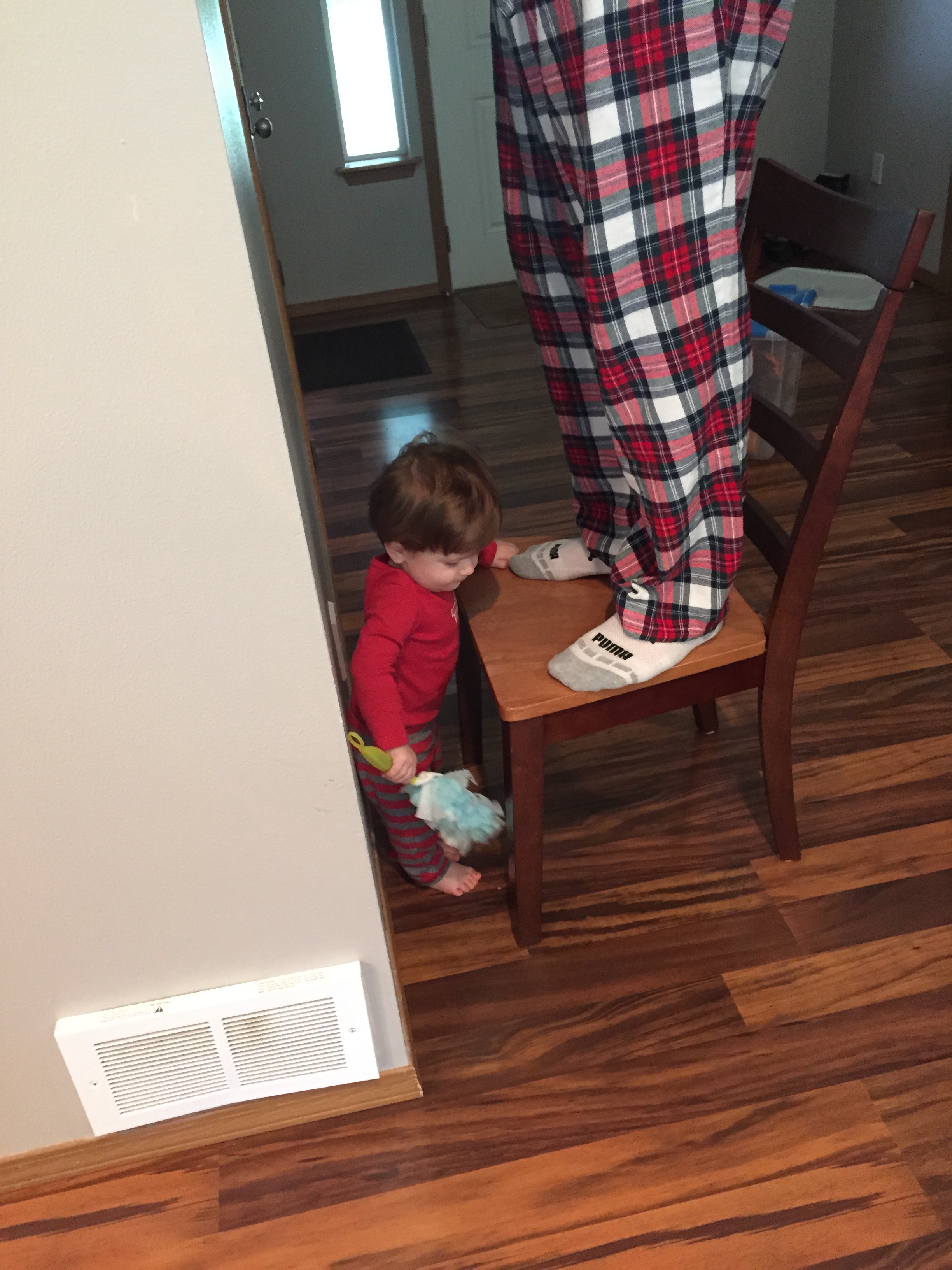 Usually the Friday after Thanksgiving is a big hunting day for Jeremy. I end up decorating the house by myself while he is out in the woods. This year Jeremy’s season ended before the holiday weekend, so Friday was a family day spent at home in our pajamas. Jeremy jumped right into decorating the house with me. We quickly learned that decorating with a mobile Owen is a very chaotic experience. Owen was into everything. We had get creative since this is the first year decorating with a toddler in mind. Everything has to be out of arms reach. We don’t have our tree yet. That is still on our list of things to do this week. I have no idea what Owen will do with a Christmas tree and the ornaments. We are in new territory, that’s for sure!