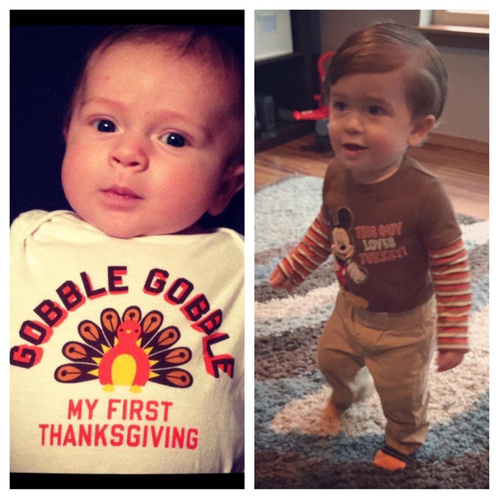 Thanksgiving day started off perfectly! Owen slept in a little later than usual. We got to watch some of the Macy’s Thanksgiving Day Parade. I made chocolate chip pancakes. Yum! Owen enjoyed pointing at the giant balloons on the TV screen. After a leisurely start to the day it was time to get ready. Jeremy made his green bean casserole to take to our first Thanksgiving celebration. Owen took a bath and then went down for a quick nap before all the festivities. Because of the late nap and my attempting to get a shot of Owen in his Thanksgiving outfit, we slid in right at the time dinner was supposed to begin with Jeremy’s family. Thanksgiving was different this year since we had a rather large crowd that no home would accommodate well. I wondered if Thanksgiving would feel weird since we weren’t celebrating at a home, but it was actually really nice. We had plenty of space and Owen had a blast running around. We learned a few weeks ago that Owen really likes both turkey and ham, so we piled up his high chair with Thanksgiving goodies and he went to town, especially on the meat. We got Owen a shirt that says, “This guys loves turkey” and it has Mickey Mouse on it. Owen loves Mickey. He kept looking at his shirt and pointing and smiling. In fact, if we pass anything with Mickey on it, he tries to touch it. This can be cute and annoying when we’re in a toy store and he gets his hands on something we aren’t planning on buying… But, I digress!