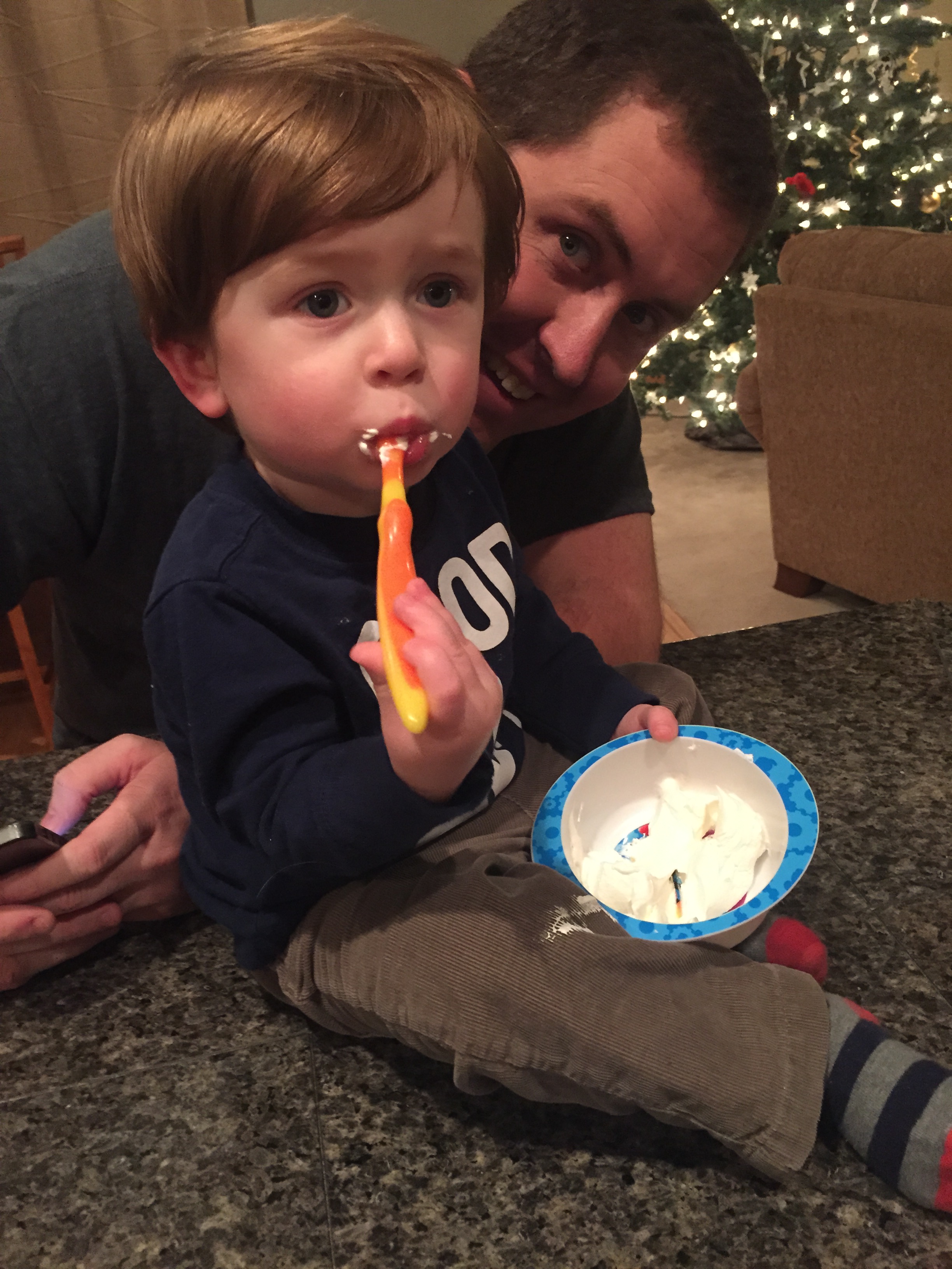 Christmas Day, we drove up to my Grandma’s house. It’s nice because things don’t start until noon, so the morning isn’t too rushed. Once the family had all arrived, we quickly dove into the present opening. The kids all draw names for each other and the adults do an optional gift exchange game. This year, Jeremy and I walked away with the gifts that we brought and we are okay with that. We always bring something we like! Owen got a ball pit from cousin’s family. We didn’t open the box for days because Owen loved playing on the box so much. He loved standing on it, sitting on it, dancing on it. In fact, this box started a love/need to stand on all boxes at our Christmas gatherings. It’s the funniest thing. After all the gifts were opened, we enjoyed a great meal, yummy desserts and time to just hang out and catch up with family that we don’t get to see often. Owen did great considering he didn’t have a nap the entire time we were there. He slept most of the ride home and we made a quick stop to wish Nana and Papa a “Merry Christmas”.