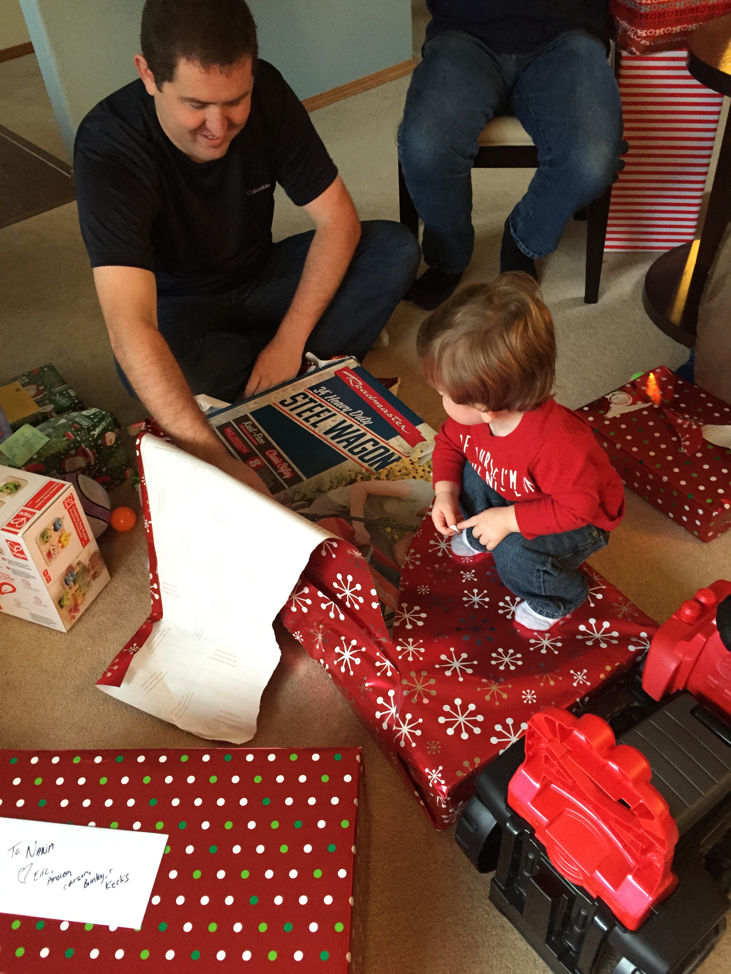 In a lot of ways, it felt like this was Owen’s first Christmas. Last year he slept through a great deal of our gatherings and he had no ability to open presents. In fact, we didn’t even get him Christmas presents from Jeremy and I since his needs were small and he would never remember that holiday anyway. Because last year was so low-key for Owen, I was super excited to see what he would think of Christmas. On Christmas Eve morning we decided to open our presents together as our family of three. Owen enjoyed pulling small items out of his stocking. When it came to actually opening presents, he was more interested in the wrapping paper and bows then the actual gifts. I was slightly disappointed that he wasn’t more interested in his new toys but Owen had a great time and that is really all that matters. The highlight for me was having a room full of wrapping paper on the floor. The sign of a good Christmas is wrapping paper everywhere! I don’t know why, but it really made it feel like Christmas for me. That afternoon, we made Owen’s favorite meal – turkey! It as a yummy meal! The evening of Christmas Eve was spent at my in-laws house playing Christmas games with the extended family. The games were fun and we all walked away with a small prize. It was a great night and a great day. It was the perfect way to kick off all our Christmas celebrations.