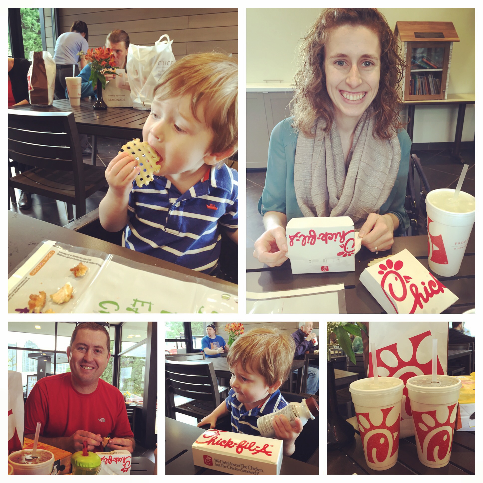 On Thursday, Chick-fil-A opened their first store in the Northwest up in Bellevue, WA. Jeremy had mentioned on Thursday night that we still had time to get up there if we wanted to go on opening day. While I love a good adventure, I had already eaten dinner and the thought of getting another meal just didn’t sound too good. After Jeremy was gone this weekend for a work related retreat, he decided to take today off as comp time for being away. It was great to have my hubby around today, but I will admit that I am now all thrown off on what day it is! It certainly doesn’t feel like a Monday. After our discussion on Thursday night, we put into action a plan to visit Bellevue today with our free day. Owen has reset to a new schedule that involves waking up at 7:00am, so we were up early and out the door first thing this morning. We hit Starbucks on our way to the Bellevue Collection – a group of stores that we only seem to hit during the Christmas shopping season. It was fun to wonder around the mall and have it be so calm and chill. We stopped by few of our favorite stores – The Container Store, The Disney Store, The Lego Store and Top Pot Doughnuts (where we wondered out with a half dozen hand-forged doughnuts)! Once we had roamed the mall, we set off to find the new Chick-fil-A. We honestly had no idea what to expect. I figured it would be busy since it’s still a really big deal and I was right. They had police officers in the parking lot helping to direct traffic. The drive-thru line was amazingly long. Lucky for us, there were plenty of parking spots since we had planned to go inside to eat. The line was at the door when we arrived, but it moved quickly. We didn’t wait long to order and our food was up almost instantly. All the indoor seating was full, so we headed outside to a covered eating area that was equipped with heaters. It was really nice. We enjoyed our meals and the the busy atmosphere as people bustled in and around us. It was a super fun and yummy activity. I glad we braved the crowds to get our first taste. Owen loved the waffle fries! Once all the waffle fries were gone, we headed back home. Owen was almost asleep instantly once he was loaded into his car seat. Now we’ve spent the afternoon taking naps and catching up on DVR’d television! Not a bad day if I say so myself!