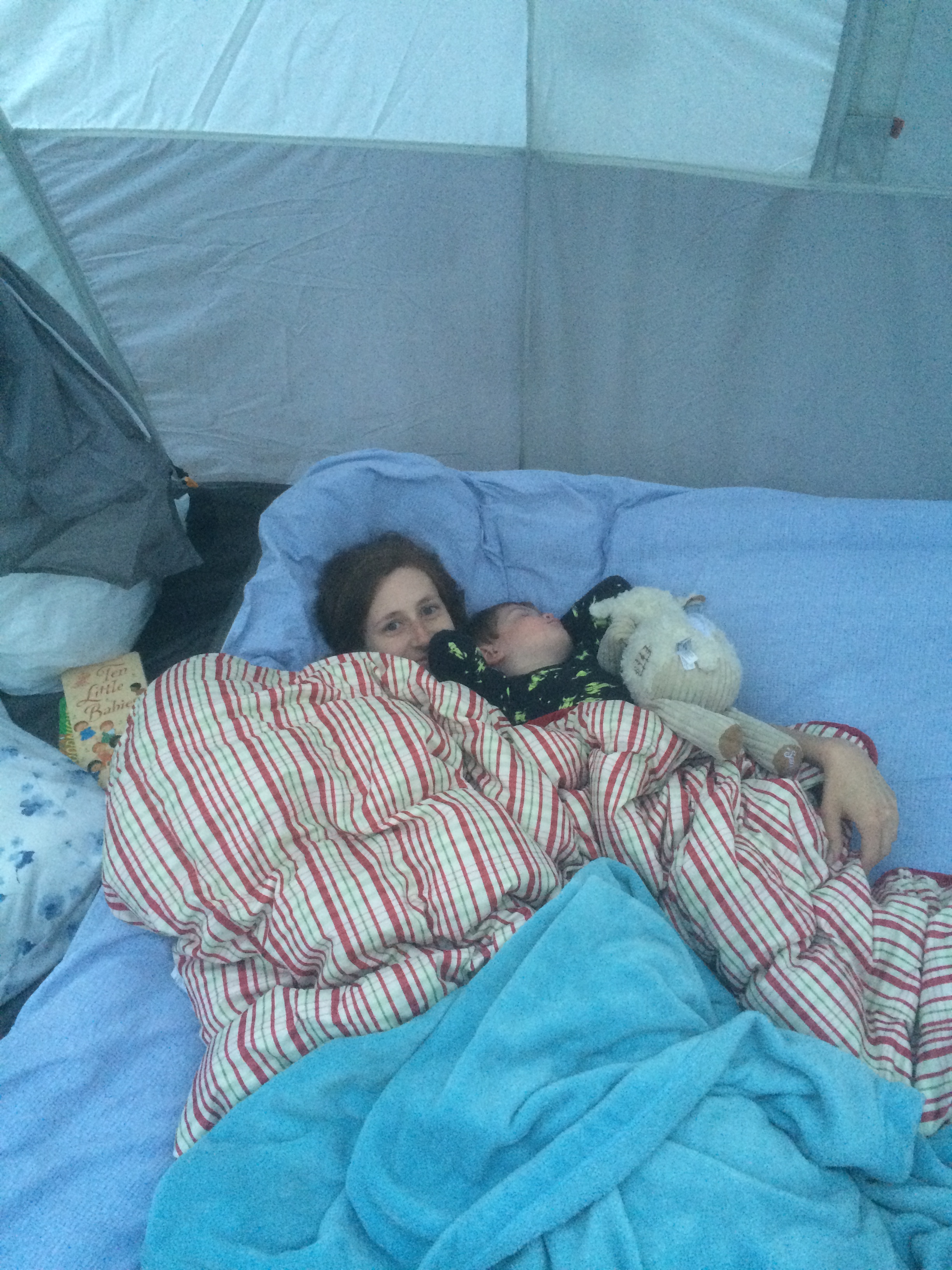 The real adventure came at bedtime. When we first got into the tent, I noticed that queen air mattress had deflated quite a bit over the afternoon. We added more air to it and then started a game of musical sleeping bags. Ideally, Jeremy and I would have slept on the queen together and Owen would have slept on the twin. This will be a goal for future trips as Owen gets older. The final arrangement ended up being Owen, Toby and I all on the queen air mattress with Jeremy on the twin. Getting Owen to sleep took some time, but around 11:00pm the tent was finally down for the night. Or so I thought… I woke up around 1:00am and realized that I was laying on the ground. Our air mattress was leaking air somewhere. I told Jeremy, who was also awake. Owen was sleeping through it all so I thought I would hold out. However, I couldn’t fall back asleep. Being pregnant and all, I get up and use the restroom a couple times a night. I was really trying not to do that while out camping, but after a couple hours of being awake in the middle of the night, I decided I had to go. This meant it was a family outing since Owen woke up when I tried to get up. Toby and Jeremy went and used the men’s room and Owen and I went into the ladies room… at 3:00am. Good times. We added more air to the mattress and got Owen settled back down. I think I was asleep sometime after 4:00am and woke up on the ground again around 6:00am. That put me at a grand total of 4ish hours of sleep… with my toddler plastered to me all night, sleeping on the ground and 27 weeks pregnant. Not the best sleep I’ve ever had. I was sore and tired the next morning.