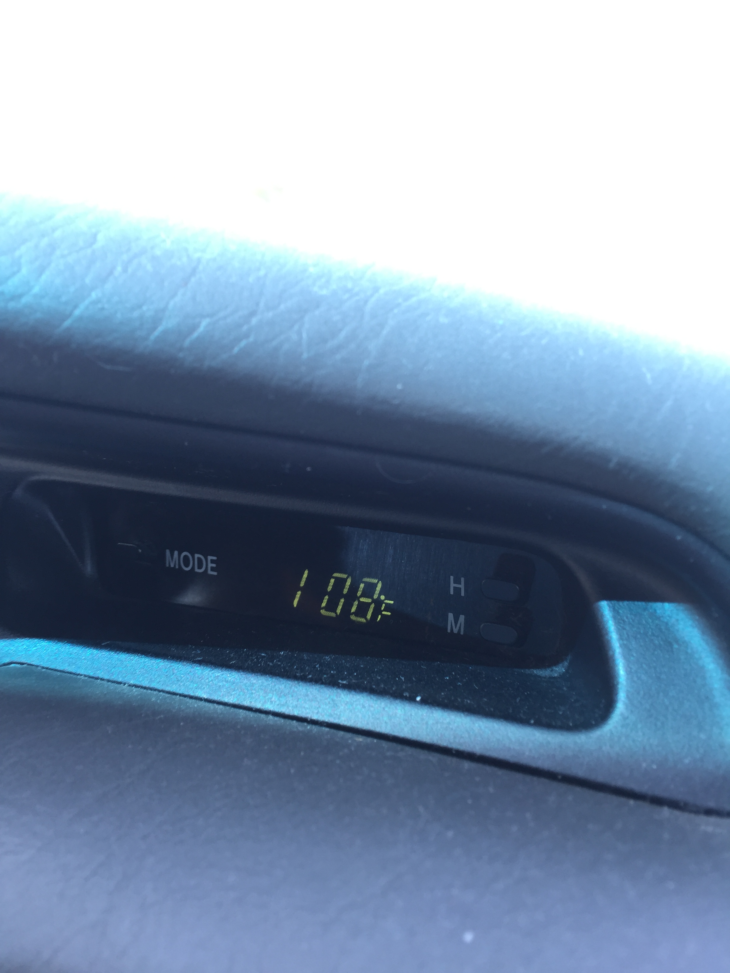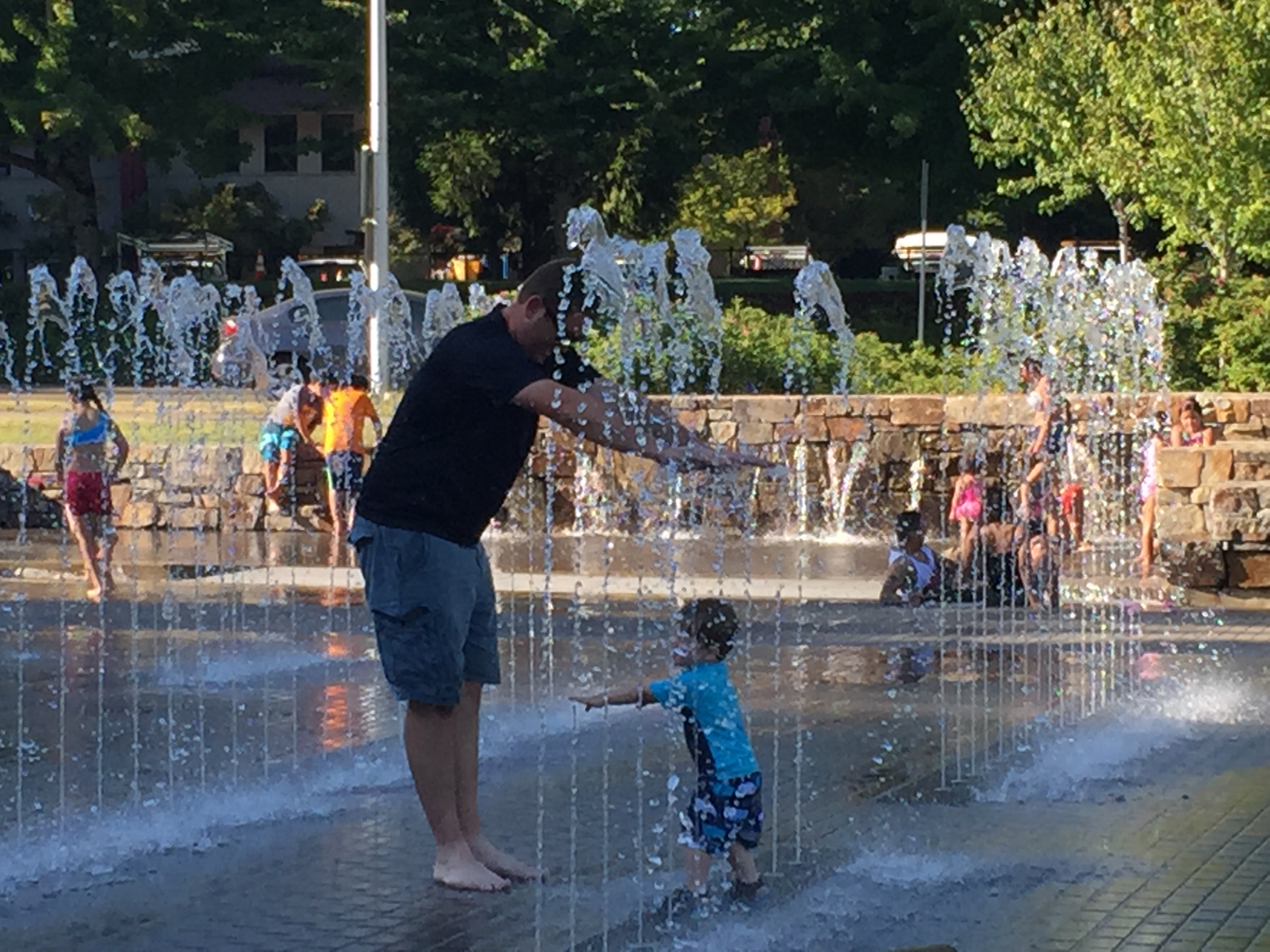 Our plan for the day already included in a drive around the lake to the various lookout spots. After we got packed up, we did our drive and then left the park. It was a HOT day and we were amazed at the temperatures our car thermometer were showing. Since it was a 6 hour drive home, we had to make a couple stops for Owen and Toby to stretch their legs. However, the heat made these stops quick. Also, we couldn’t do anything indoors since we had the dog to think about. There was no way we could leave him in the car. Once we got just outside of Portland, we decided to skip the rush hour traffic and find a park to relax in for a while. We got some dinner, ate outside in the shade and then played in the spray park. Owen enjoyed the time out of the car and splashed away while we waited for traffic to clear. It was a nice way to break up the time in the car. Also, I think the water at the spray park did a good job of getting the layer of dirt off of Owen that he had developed while camping.