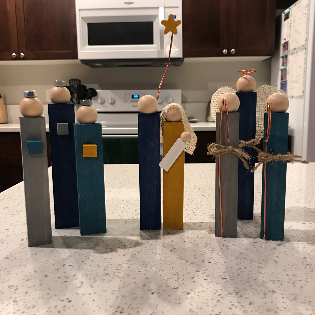 Our MOPS & MOMSnext group met online on Monday night. It was our Christmas craft meeting. It’s been an adventure adapting our usual format into an online experience. Our creative team assembled kits so the moms could create a rustic nativity set at home. We did porch pick-ups for the kits and I had a few ladies opt to pick-up from my home. I enjoyed putting on a mask and heading outside for a few minutes to say hello while the ladies loaded up their kits. I’m not a super crafty person, so this craft had me a little nervous. I was so pleased with the end result, though! All I had to do was paint, accessorize, and glue. It’s been fun to see how the other ladies decorated their kits. This experience was definitely a win for our group!