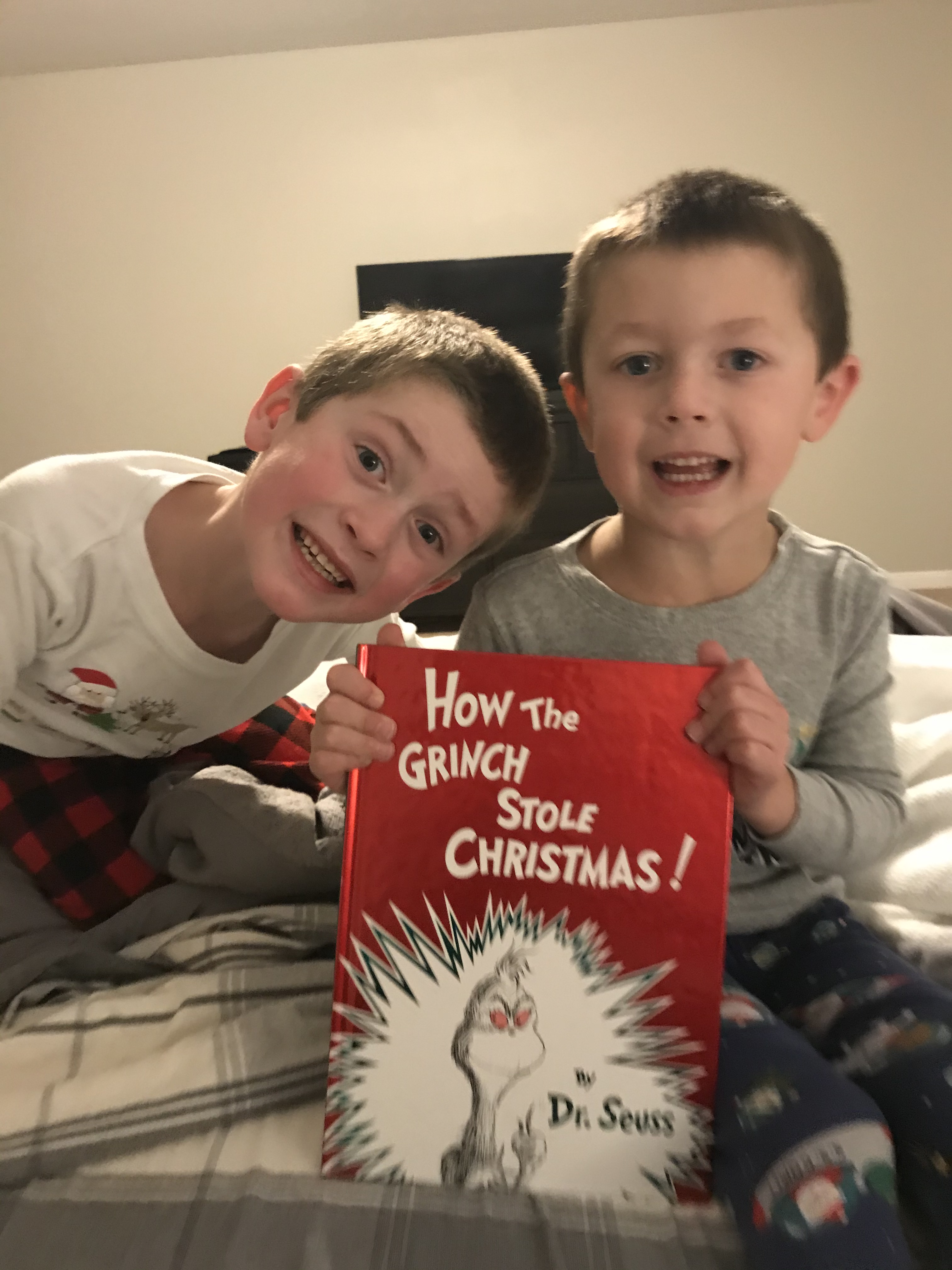 On Wednesday, we read for the first time the original How The Grinch Stole Christmas. The boys love the cartoon version, so this seemed like the perfect addition to our home library. Also, another classic kid Christmas thing and I’m honestly not sure if I’ve ever read the actual book before… at least not in a few decades anyway… I really can’t remember.