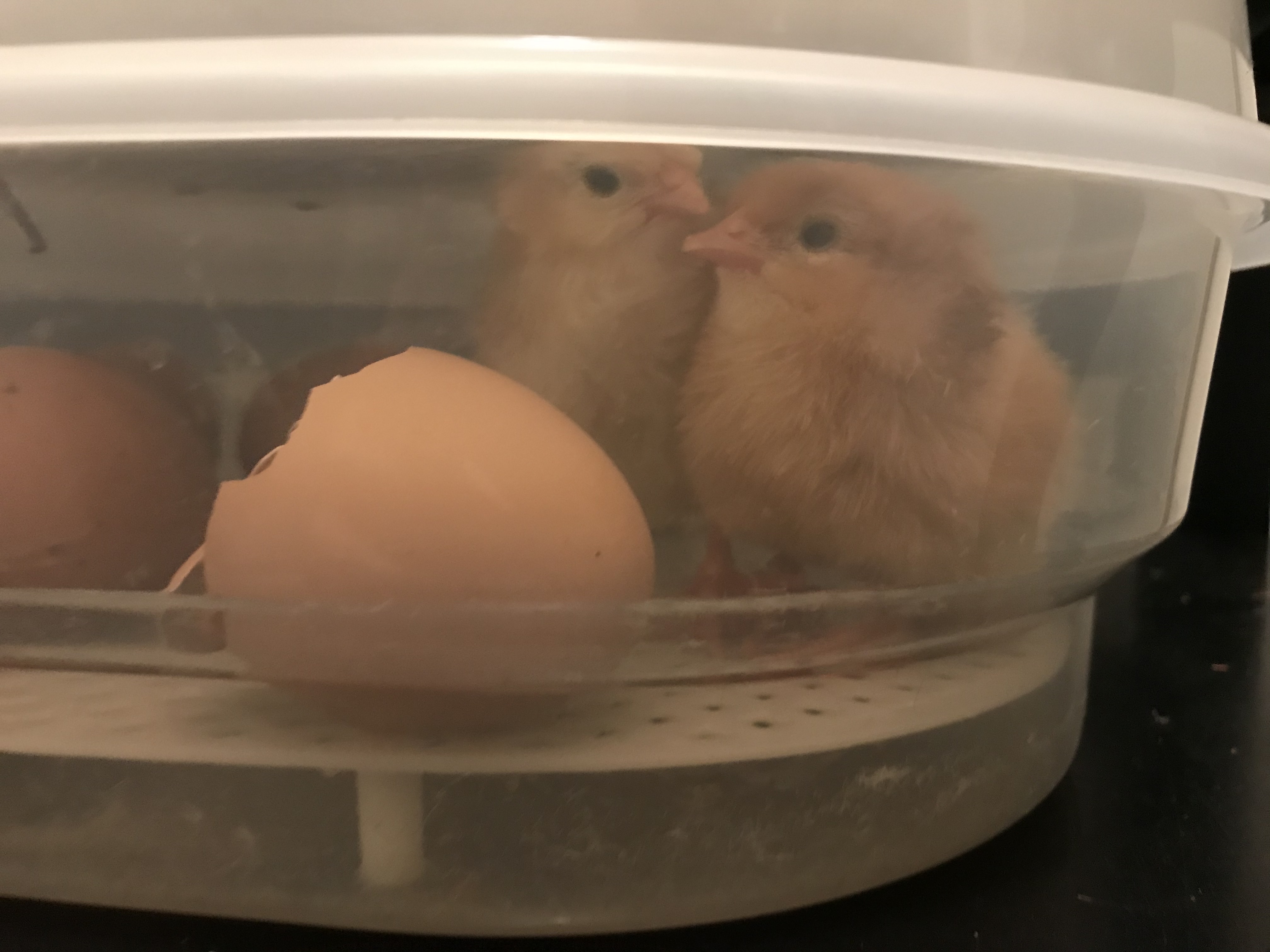 We had some excitement on Easter Sunday beside the holiday. Our second round of incubator eggs started to hatch. Our first round was a flop, but round two came through for us! When we were putting on our shoes to say hi to my parents, the boys noticed that two eggs had cracks. We were ecstatic! When we arrived home from our egg hunt, we had found one chick waiting for us in the incubator. Before Jeremy and I went to bed later that evening we heard more peeping from the incubator. We discovered chick number two made it’s arrival as well. We only had two hatch at this point and we think that is probably all we will get from this batch. We’re letting the incubator run for a few more days, just to be sure. While picking up some chick supplies yesterday morning, Jeremy also got two more chicks from the farm store. Our chick total is now at 4. We are hopeful that these chicks will be hens so we can add them to our flock. Any roosters will will given to our local chicken auction down the road. It’s fun having chicks again!