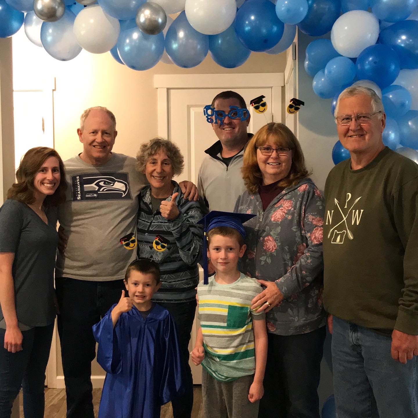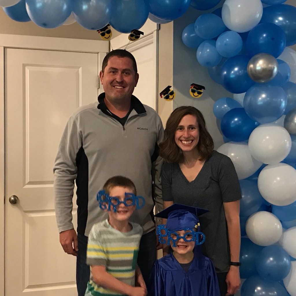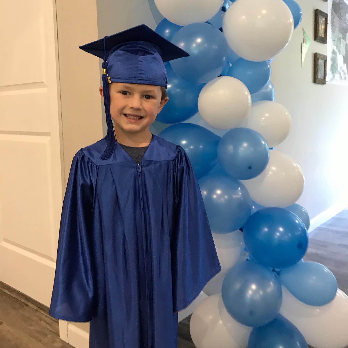 Thursday night was our end of the school year celebration and preschool graduation. I was looking forward to this party as much as the kids. I’m a big fan of celebrating – big things, small things, all things. If I can get themed partyware and put up decorations, I’m a happy camper. After we wrapped up school, we created a table to display the boys’ work. The grandparents got to “ooo” and “ahh” at what the kids have accomplished. We did dinner and dessert. The boys’ favorite food is Papa Murphy’s pizza. Owen picked chocolate cake for dessert and Graham selected cinnamon rolls. We got mini bottles of sparkling cider to add a festive flare. Jeremy helped me create a slideshow with pictures from our school adventures. We created a balloon garland and had some fun props for photos. Graham donned his cap and gown and we took pictures with Pomp and Circumstance playing in the background. We had a blast! It was the perfect way to wrap up the school year.
