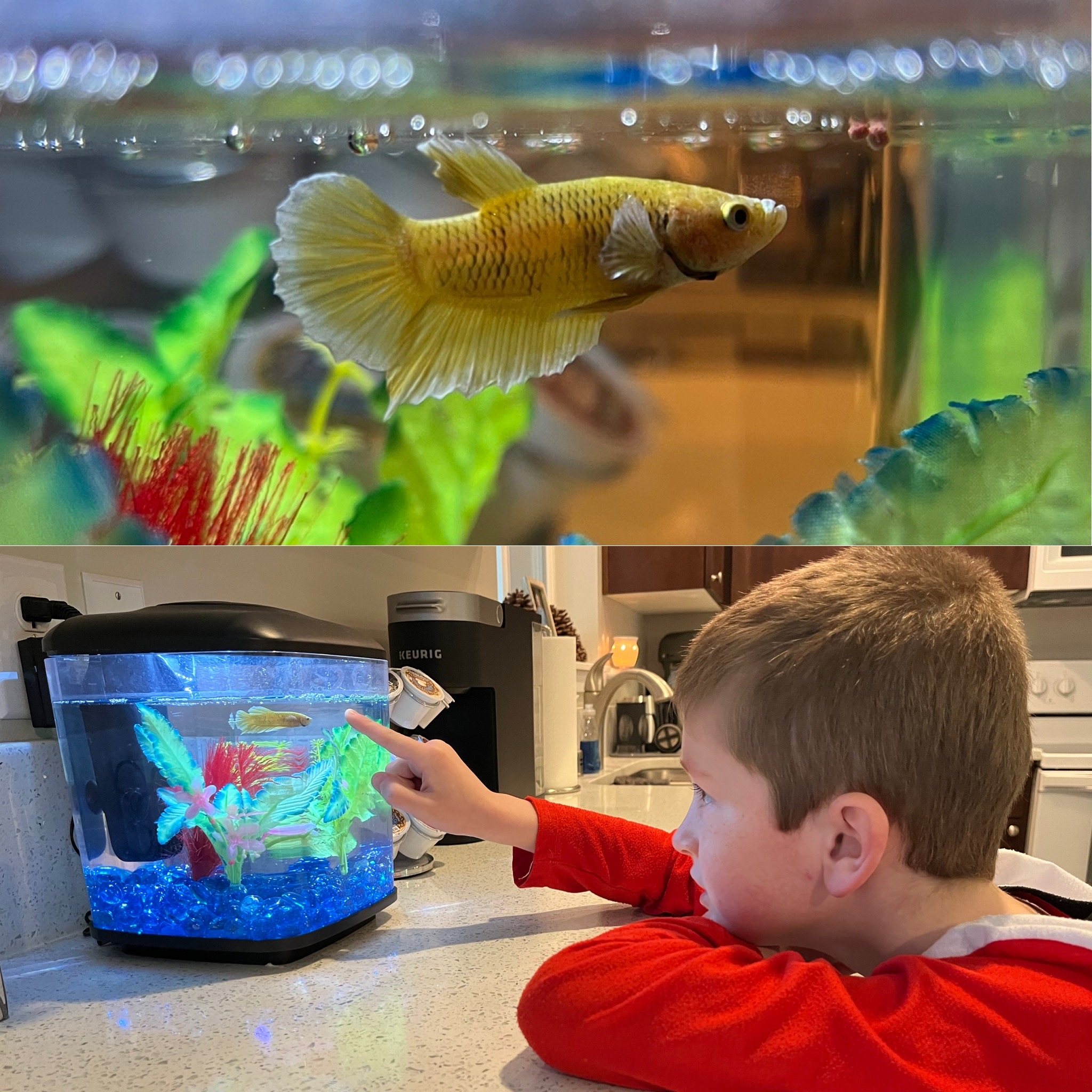 A non-birthday related highlight of Friday was Owen got a new betta fish. Last week, our second betta, Finn, died. We knew Finn’s end was near so it wasn’t a shock. Owen was very excited to look for a yellow betta to replace Finn. Our local pet stores haven’t carried yellow bettas in the past so we wanted to look in the “big” city for more variety. The pet store we visited had only one yellow betta and Owen jumped at the chance to take him home. Owen is now the proud owner of Sunny.