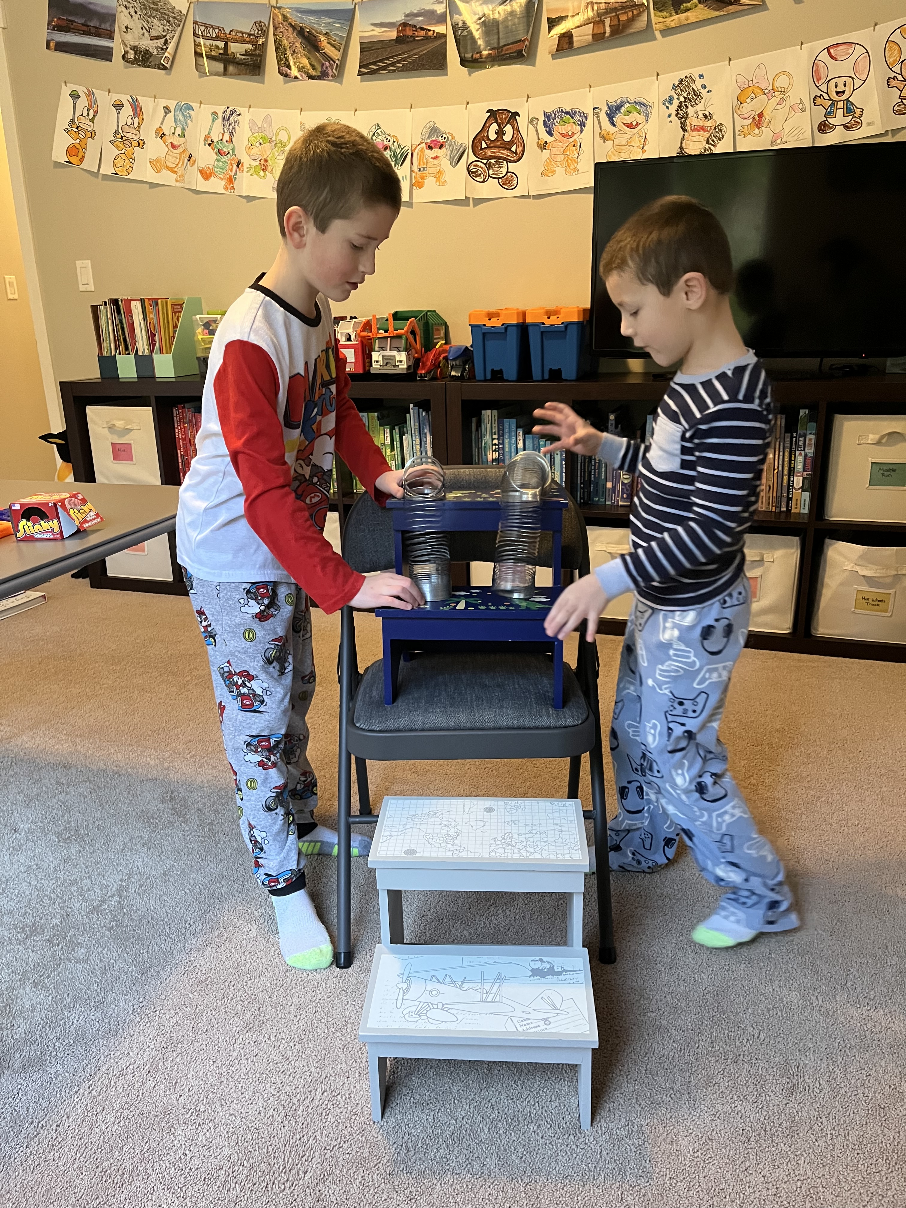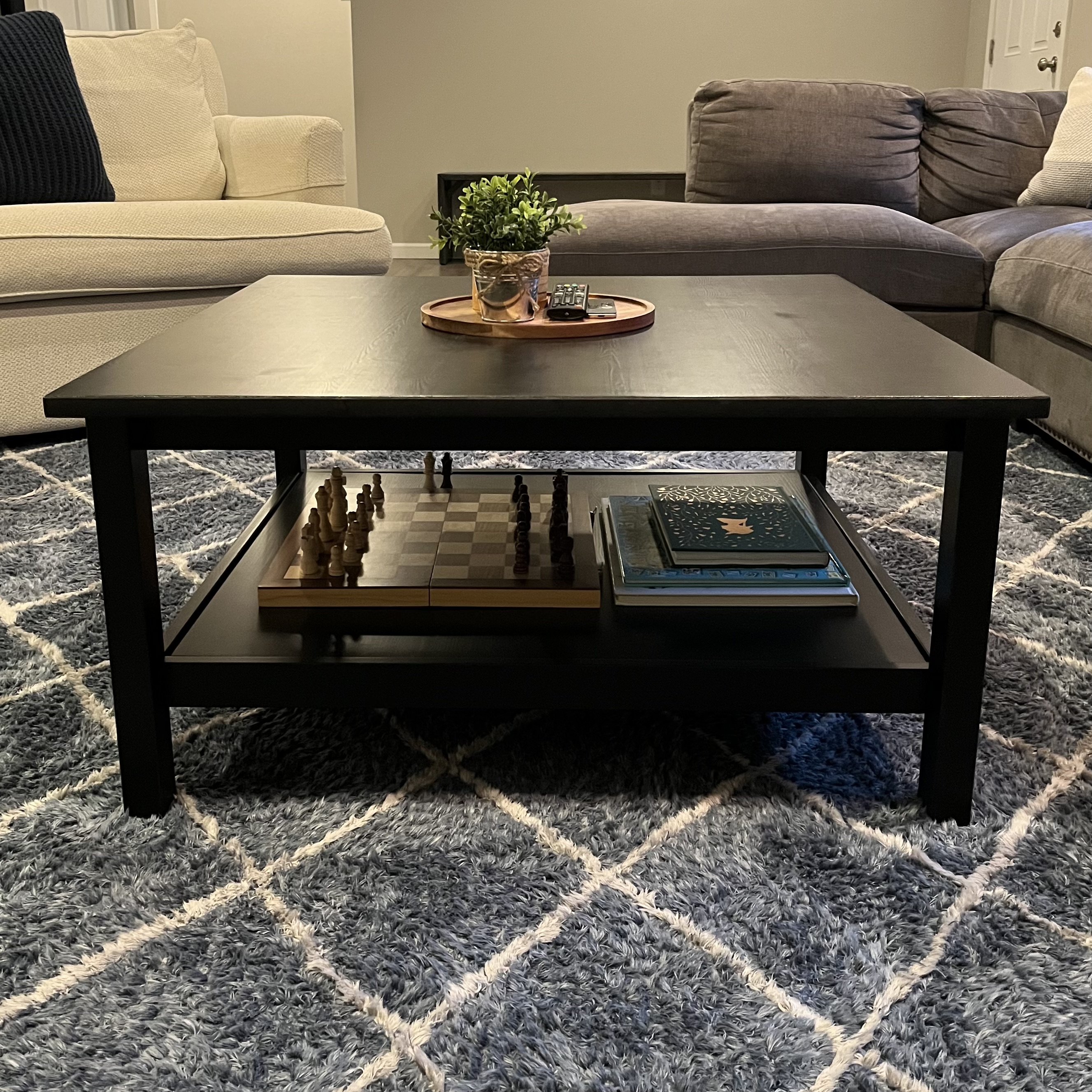 I’ve enjoyed styling our new coffee table. It’s been the project of the week. I pulled out the nice chess set the boys got for their birthday and set it up on the lower shelf. Beside the chess set, I have a beautifully illustrated nature poetry book (The Lost Words), a Where’s Waldo book (for fun), and my new PEI landscapes book. On top of the table, I found a tray to hold our remotes, coasters, and a fake plant to finish the look (I have no desire to keep real plants alive, not my skill set).