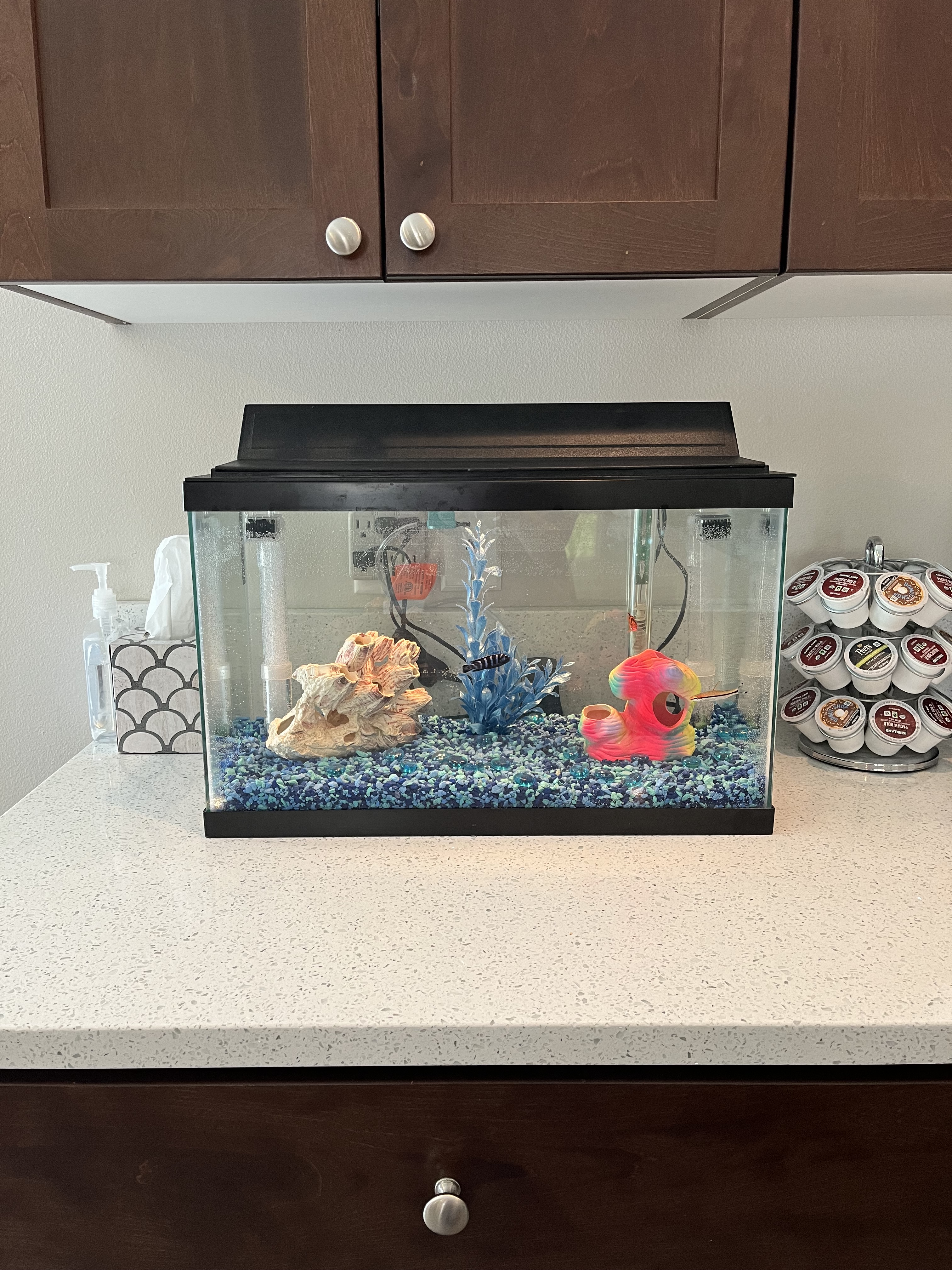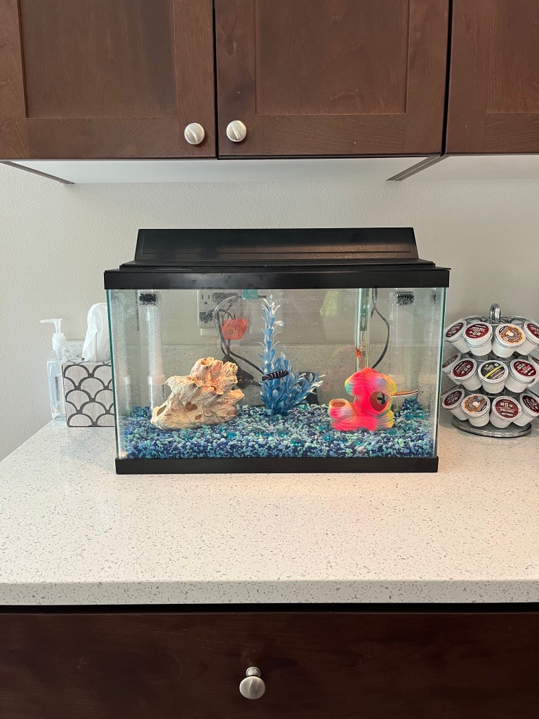 On Friday, March 3rd, Jeremy decided to clean up a hand-me-down fish tank in hopes of upgrading our kitchen counter fish experience. Owen’s betta, Sunny, relocated to Owen’s room to make space for the larger fish tank. On Saturday, Jeremy and the boys went on a fish finding quest. They each came home with a fish and the grand fish adventure began. We prepared the boys for the fish might not to survive the experience. We knew acclimating to a new tank can be difficult. This was true for Sunset, the fish Owen picked. (Did his name possibly lead to his demise?!)