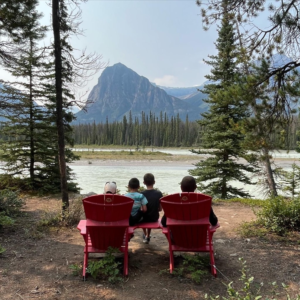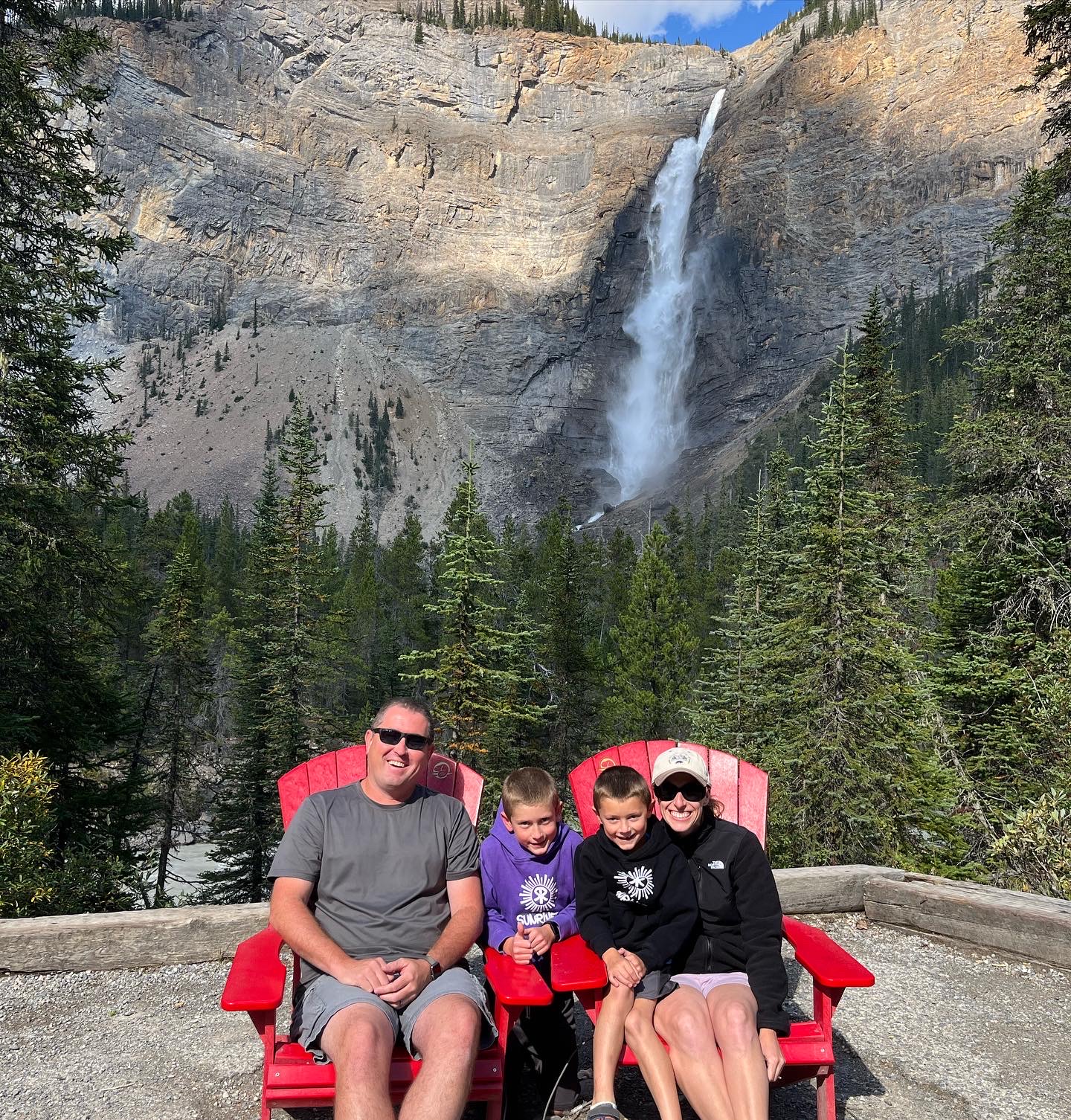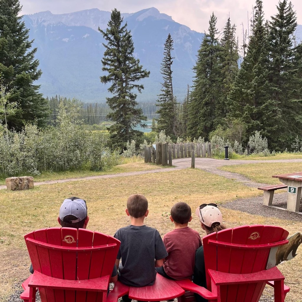 Our day started with breakfast at Tim Hortons! Yum! I got a tasty apple fritter which might be my new favorite treat at Timmy’s. It was fun to introduce the kids to Canadian staple. We took off for the rugged Rocky Mountains on this leg of the journey. Outside of Golden B.C, we saw a moose from a distance. According to Jeremy, it was a bull, but I didn’t get a great look at it. We stopped at McDonalds for a second Squishmellow treat in Golden for lunch. This travel day with filled with scenic views and looming mountains. We saw a herd of bighorn sheep outside of Golden. We drove through Canada’s Glacier National Park and stopped at the Yoho National Park Visitor Centre. Because it was a big travel day, we made only one stop in Yoho – Takakkaw Falls. It was a beautiful waterfall and a scenic drive. Jeremy wanted to find the iconic red chairs at the falls for a photo opp. This inspired me to find quite a few more sets of red chairs along our journey. Parks Canada has over 200 sets of chairs set in scenic view points. It felt a bit like a scavenger hunt to find them. We crossed into Alberta and changed time zones to Mountain Time. Our final destination was our condo in Canmore A.B. Dinner was Pizza Hut directly under our condo and a quick to Safeway and Canadian Tire to end the day.