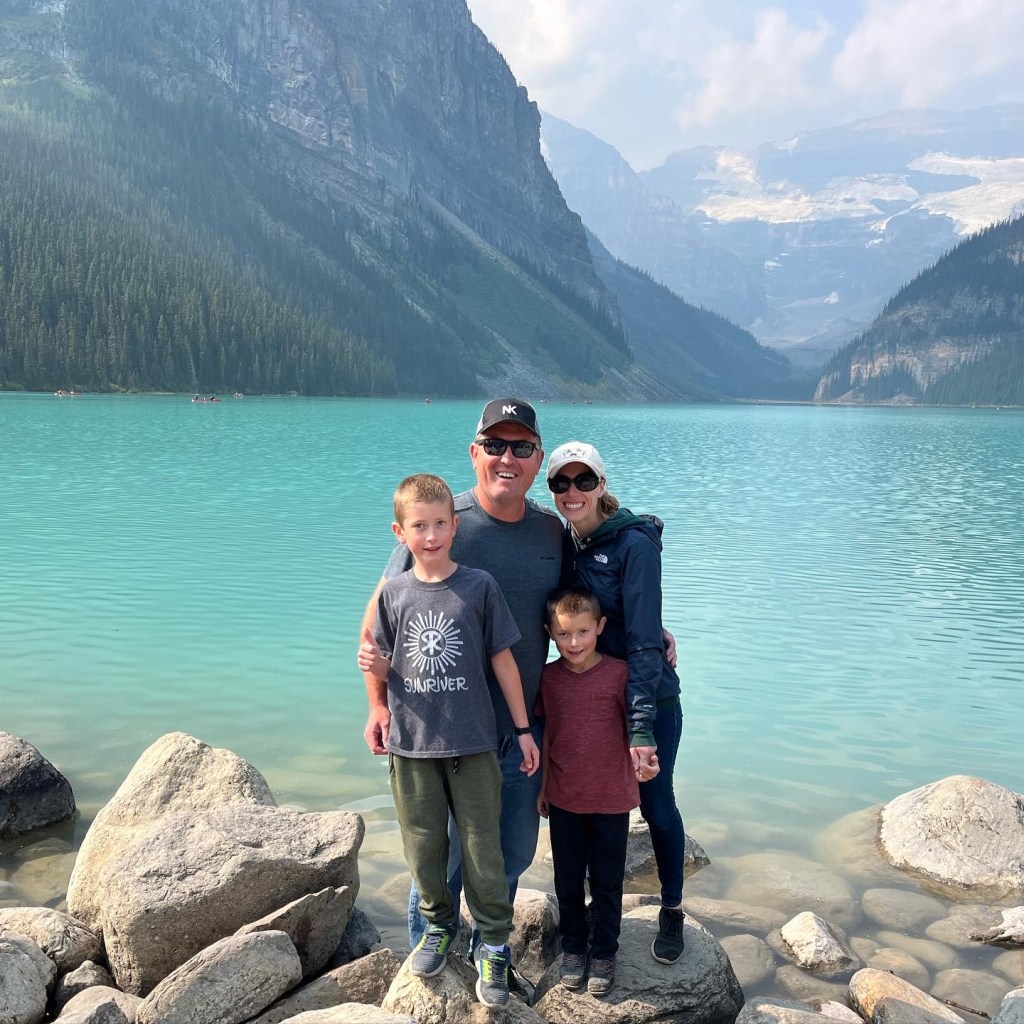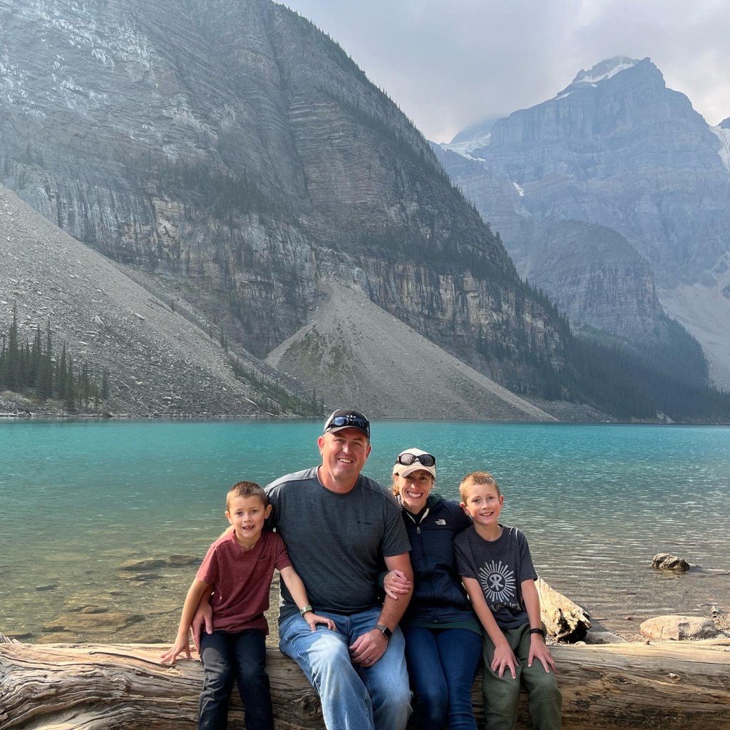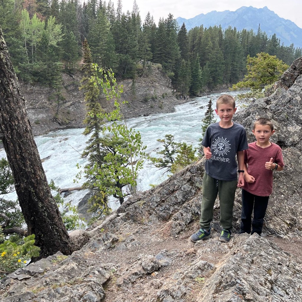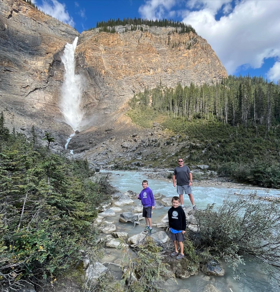 Our day started with breakfast at Tim Hortons! Yum! I got a tasty apple fritter which might be my new favorite treat at Timmy’s. It was fun to introduce the kids to Canadian staple. We took off for the rugged Rocky Mountains on this leg of the journey. Outside of Golden B.C, we saw a moose from a distance. According to Jeremy, it was a bull, but I didn’t get a great look at it. We stopped at McDonalds for a second Squishmellow treat in Golden for lunch. This travel day with filled with scenic views and looming mountains. We saw a herd of bighorn sheep outside of Golden. We drove through Canada’s Glacier National Park and stopped at the Yoho National Park Visitor Centre. Because it was a big travel day, we made only one stop in Yoho – Takakkaw Falls. It was a beautiful waterfall and a scenic drive. Jeremy wanted to find the iconic red chairs at the falls for a photo opp. This inspired me to find quite a few more sets of red chairs along our journey. Parks Canada has over 200 sets of chairs set in scenic view points. It felt a bit like a scavenger hunt to find them. We crossed into Alberta and changed time zones to Mountain Time. Our final destination was our condo in Canmore A.B. Dinner was Pizza Hut directly under our condo and a quick to Safeway and Canadian Tire to end the day.