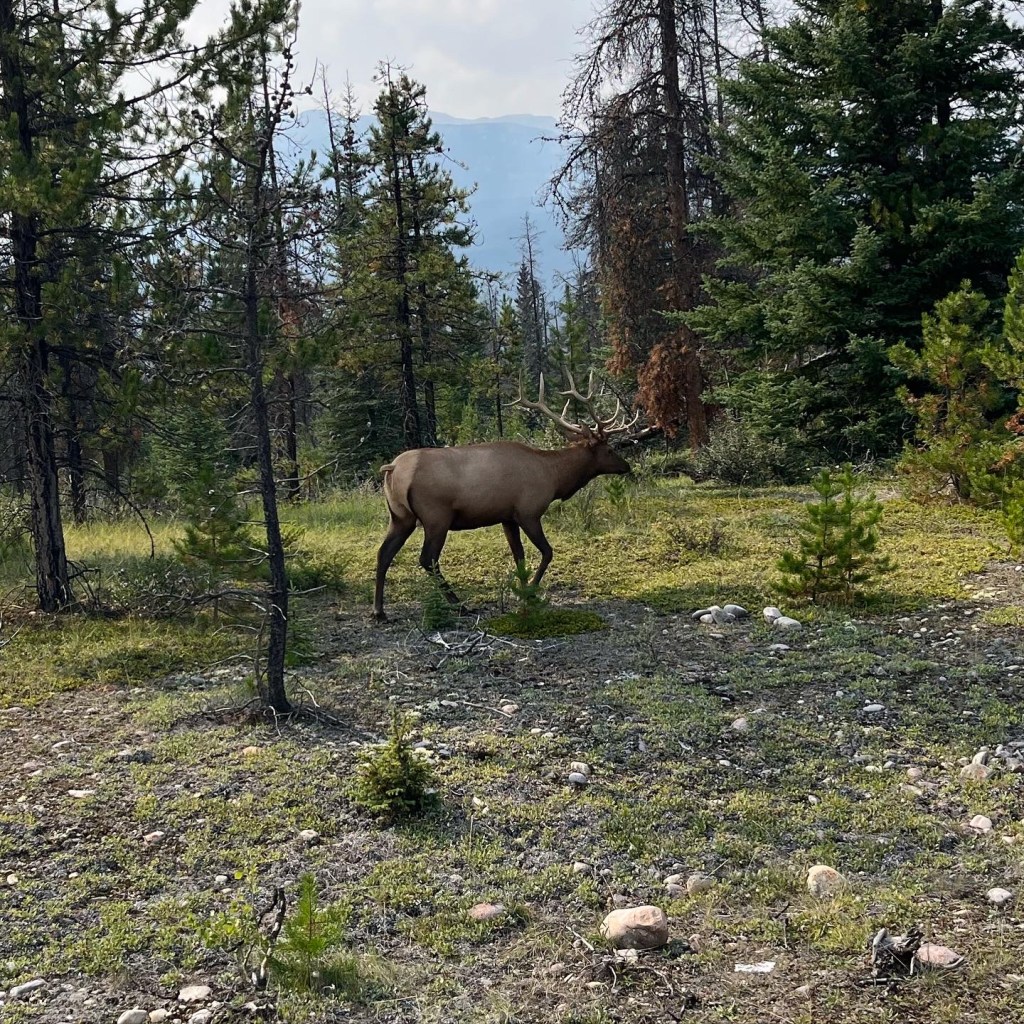 We took a scenic drive up the Icefields Parkway which starts in Banff National Park and ends in Jasper National Park. The entire day took us about 12 hours in total. It takes about it’s about 6 hours of driving total and then add in all the stops along the way. We saw the Columbia Icefields, Sunwapta Falls, and Athabasca Falls. We had a picnic lunch at Mount Christie, where we found a set of red chairs. We walked a bit around Jasper Townsite. The kids loved seeing the trains in Jasper. The Icefields Parkway is known as one of the most beautiful drives in the world. Unfornately, we had some smoke haze so it wasn’t clear, blue skies. The mountains were still visible and certainly still impressive! Outside of Jasper Townsite, we also saw huge bull elk. It was the animal find of the day! After a full day of exploring the parks, we had a late dinner at a burrito shop in our condo building.