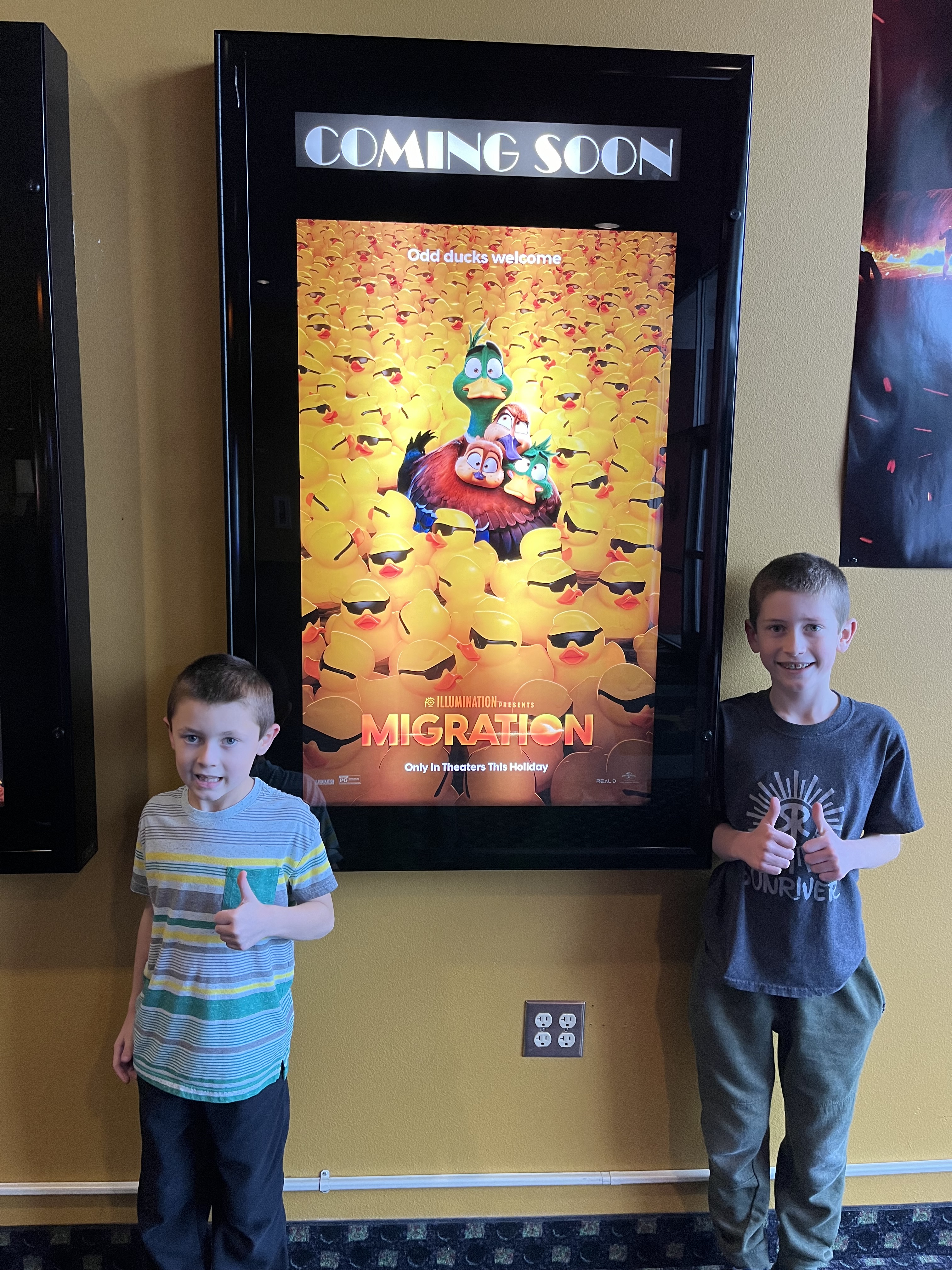 Now that Christmas has wrapped up, the rest of our break is continued time with family and friends. Yesterday, my forever friend, Christa, and I got together for lunch while she’s on her holiday school break. After lunch, Jeremy and I took the boys to see Migration in theaters. We don’t go to the movies very often, so this was quite the treat for the boys. Owen got an ICEE since chewy candy is a no-go with him metal mouth and Graham ate through a whole bag of Sour Patch Kids. A movie about birds seemed perfect for our young ornithologists. Based on all the giggles I heard, the move was a hit.