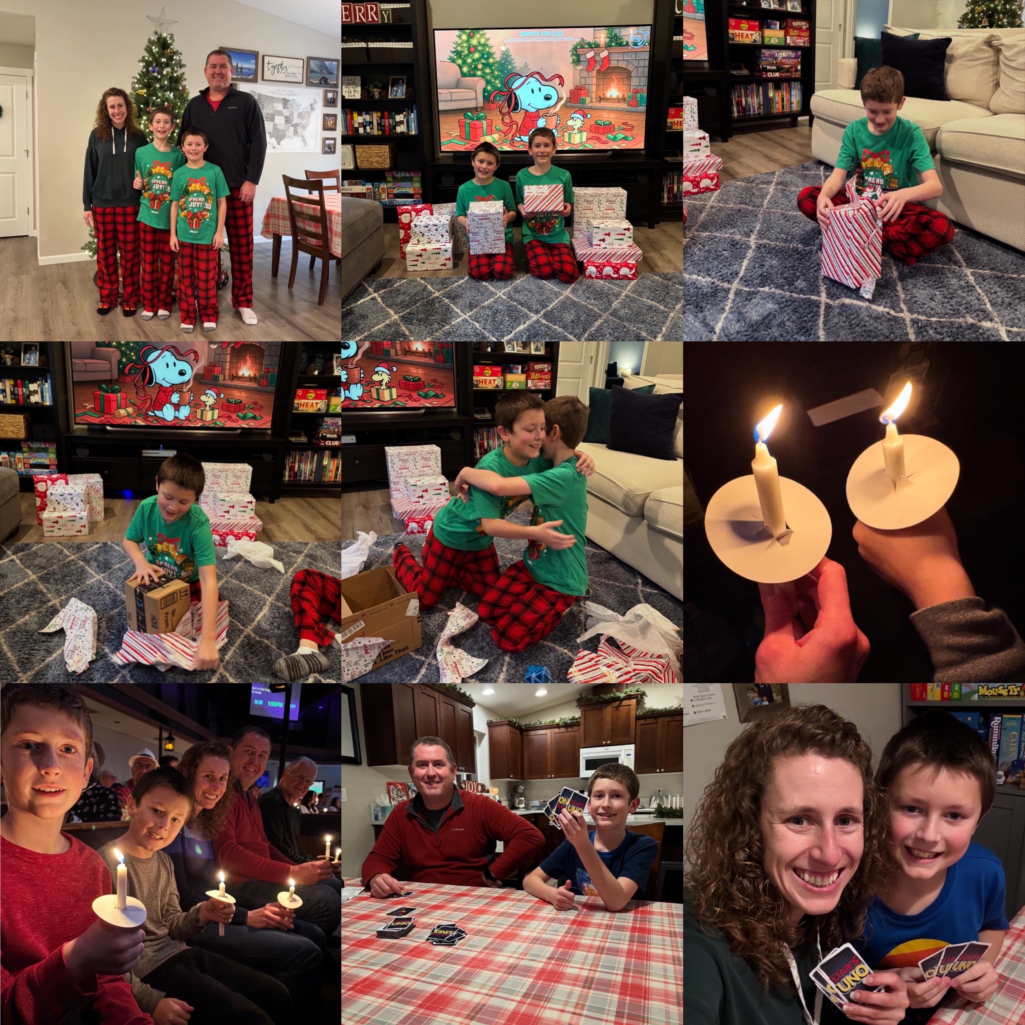 Wednesday was Christmas Eve and our family celebrated all day long! We started the day with cinnamon rolls. After breakfast, the boys opened their Christmas gifts and we took pictures in our matching pajama pants. We enjoyed a festive turkey lunch before heading to church for a candlelight Christmas gathering. Nana and Aunt Patty were part of the a chime choir that played before the gathering. We got there early to cheer them on! Our evening was spent watching White Christmas and playing Graham’s new game – Liar’s Uno!