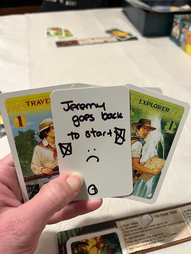 Adding a little sabotage to Eldorado. Jeremy wins too often! The boys and I made these joke cards for a good laugh.