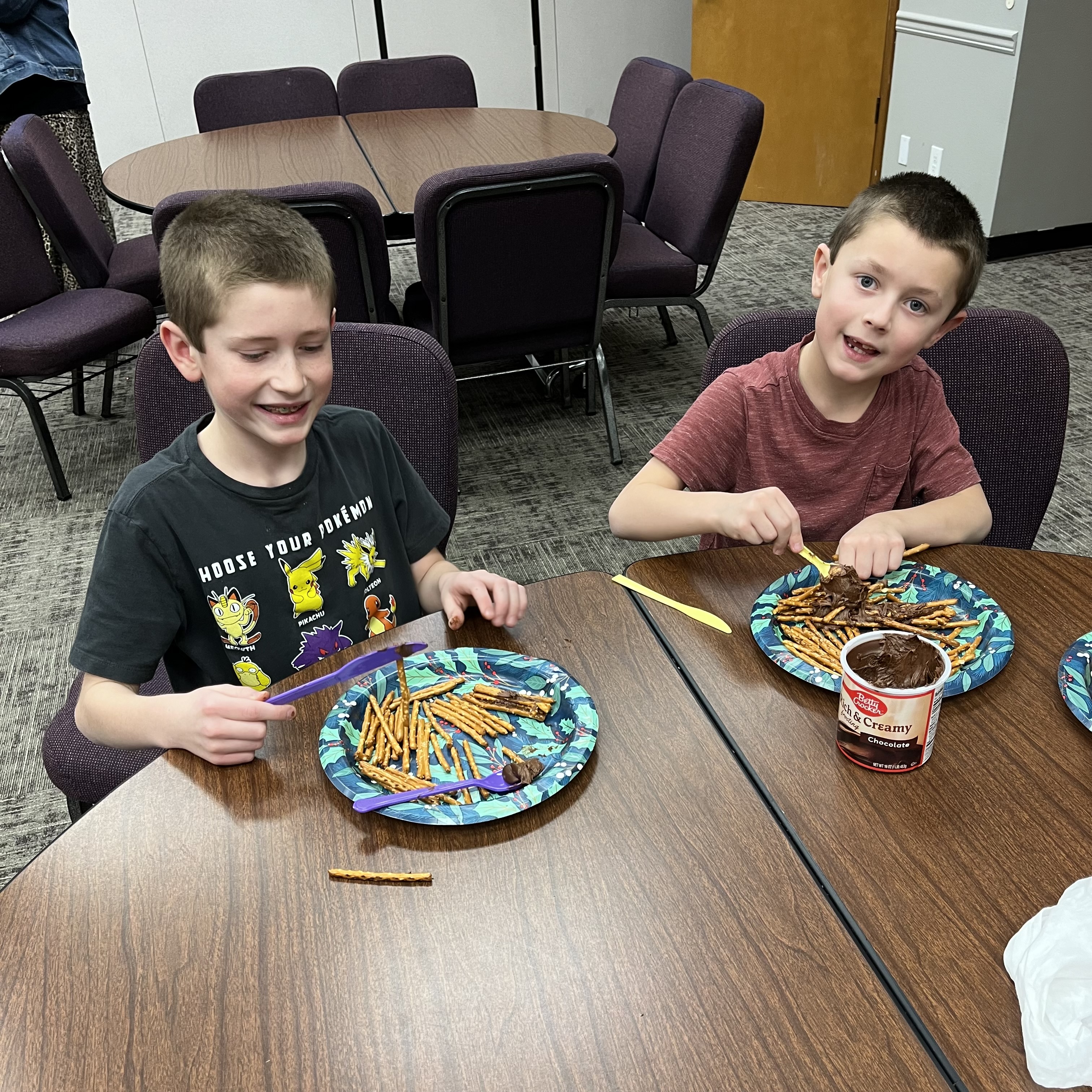 Attempting to make a beaver dam out of pretzel sticks and chocolate frosting for co-op book club.