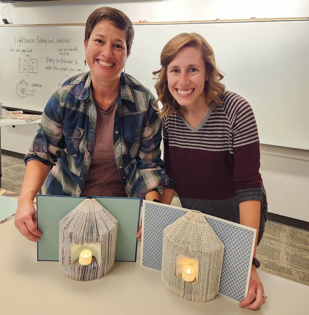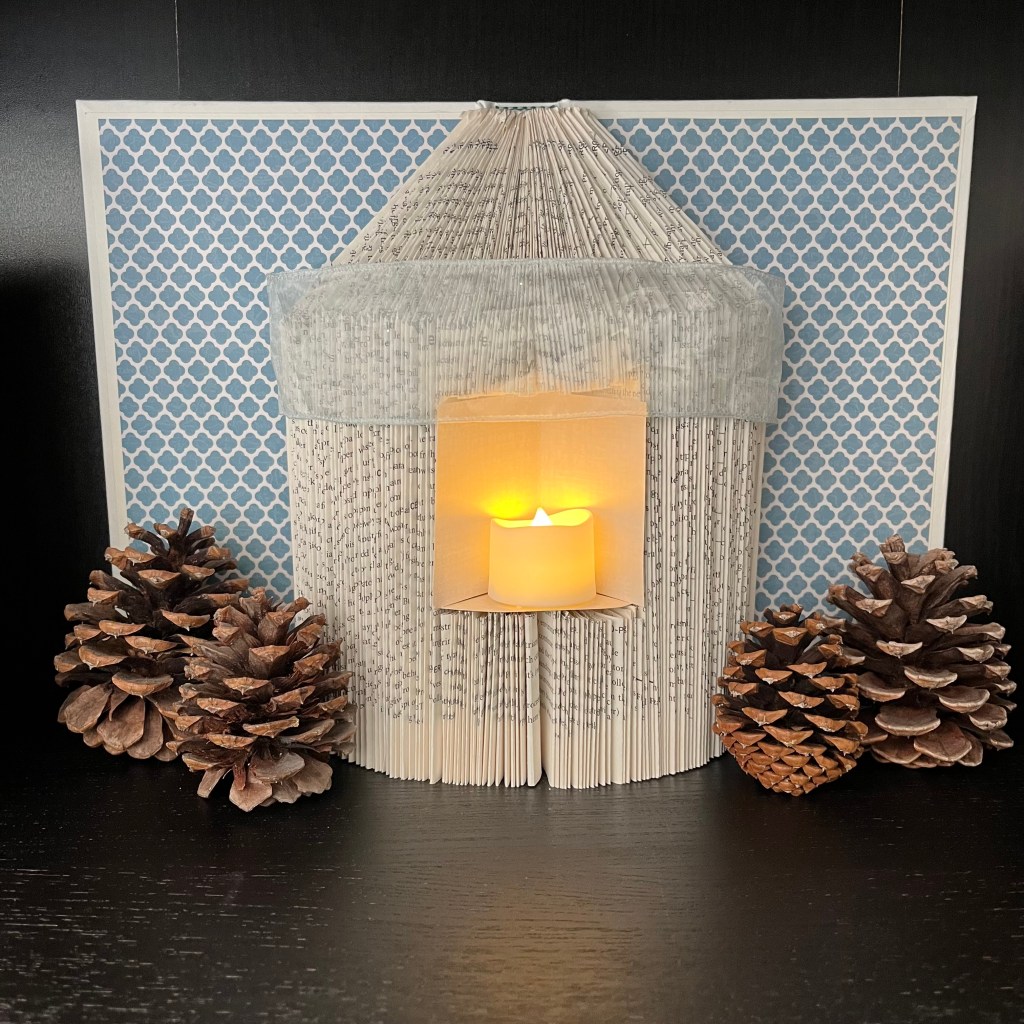 My forever friend, Christa, invited me to join her for a book folding craft at her local library. I had some reservations about my crafting skills, but a book related day out with my friend sounded enjoyable. The group that assembled to craft was diverse and the instructor was full of personality. To finish the craft in the two hour window of time was a bit of a task. We really had to hustle. We made lanterns out of folded books and battery-powered candles. When I got home, I added a bit of ribbon and found a home for my lantern. I wasn’t sure if I would create something worth displaying, but I’m happy with how it turned out!