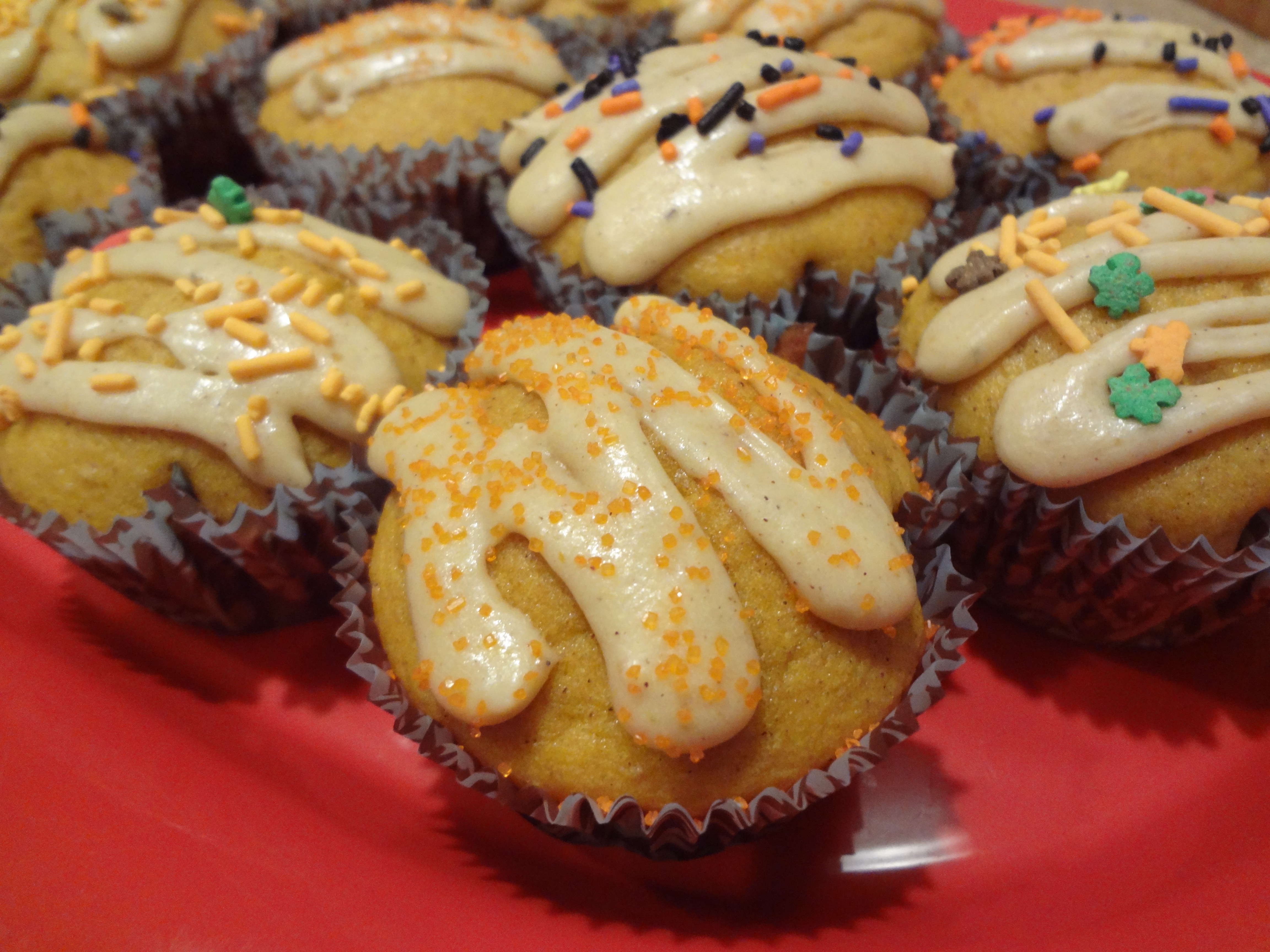 I tried to make the frosting really thick, but I found that when I started to pipe it onto the cupcakes it started to soften just a little too much. Instead of completely frosting the cupcakes I decided to go with a drizzle effect. The pumpkin on pumpkin flavoring is good, but I thought less is more in this situation. Once the cupcakes were frosted, I used holiday sprinkles to add the finishing touch.