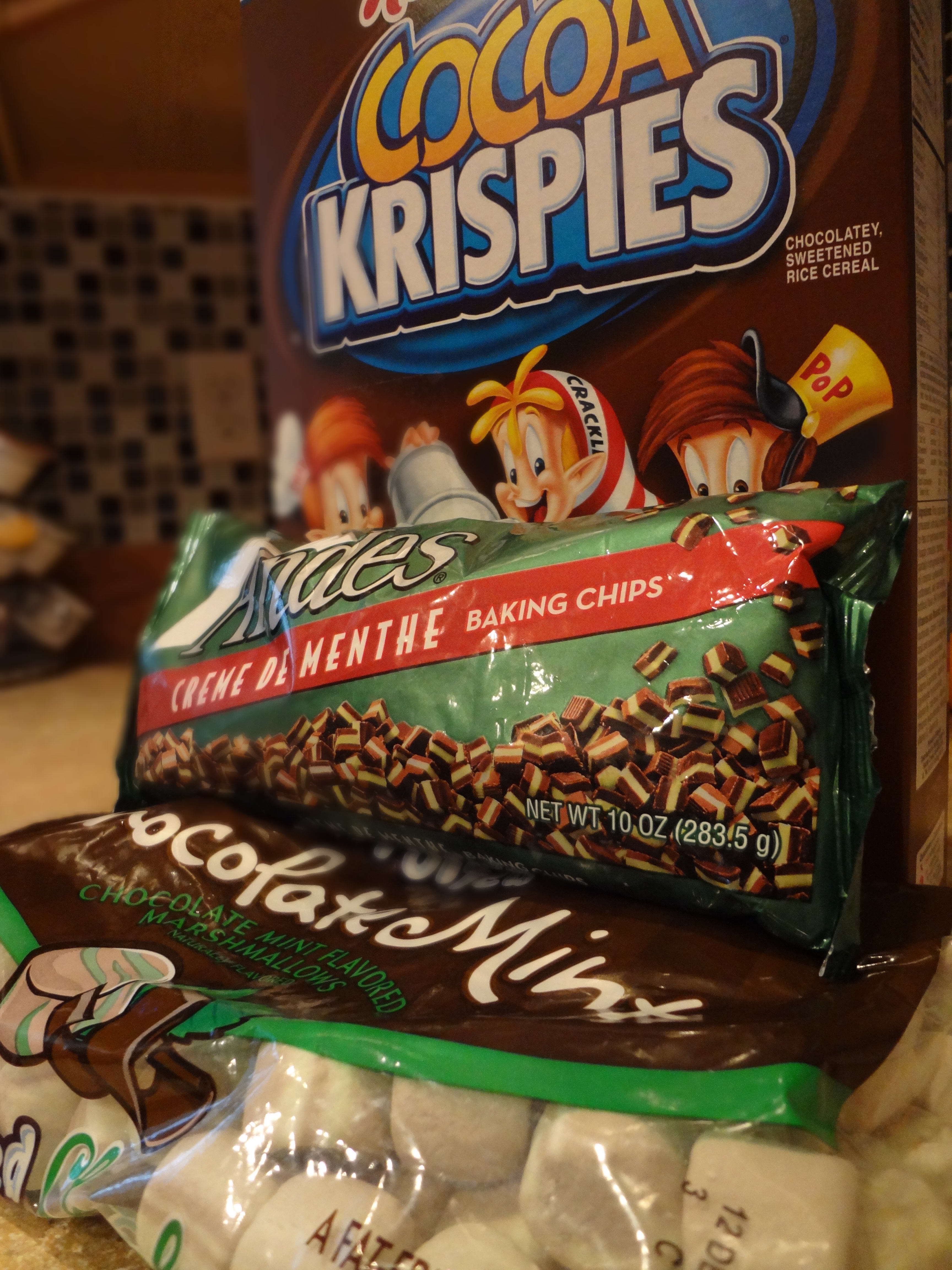 With these learning experiences in mind, I set out to make another marshmallow creation. This time I used Cocoa Krispies and Jet Puffed Chocolate Mint Marshmallows. To finish off the taste and presentation, I sprinkled Andes Mint baking chips on the top. In my opinion, the marshmallows don’t really taste all that chocolatey or minty. I melted them in them in the microwave and during the process the brown and green coloring blended to make a strange color. The Cocoa Krispies are very
