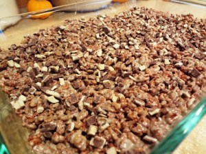 In a previous blog, I explained that Jeremy and I have an abundance of marshmallows in our pantry. I created pumpkin spice marshmallow treats a few weeks ago using Cinnamon Burst Cheerios and Jet Puffed Pumpkin Spice Marshmallows. This creation tasted great, but I learned a few things from the experience. First – Cheerios are harder to cut than Rice Krispies. Second – Cheerios get a soggy texture after they are encased in marshmallow. They were great the first day, but they next day they no longer had the firm texture they once had (and that was while they were stored in an airtight container).