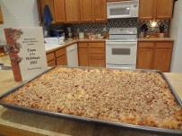 coconut, condensed milk and pecans. The second project I started was pumpkin bars with cream cheese frosting. I will admit that I just used store bought frosting. I figured with all the baking I had planned, it would be nice to have one step completed for me. The third project was raspberry ribbons. I think these were the hardest of all. It’s a cookie was raspberry jam down the middle and a glaze drizzled on top. There were more steps to this recipe and I don’t think I got the exact balance of jam to cookie down.