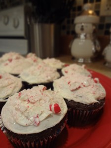 Christmas goodies. A special treat seems to make the Christmas cheer shine just a little brighter, so I spent my evening yesterday working on the snacks for tonight. The first snack I created was a chocolate cupcake with vanilla frosting and peppermint crumbles on top. I used peppermint discs and realized that candy canes might have been a better option. Pettermint discs are pretty are hard to break… I learned this by beating on them quite loudly with a rolling pin. The rolling pin came out dented from the sharp edges of the crumbles. It was intense. Next time I will use a thinner peppermint candy and I’m sure that candy canes will fit that need.
