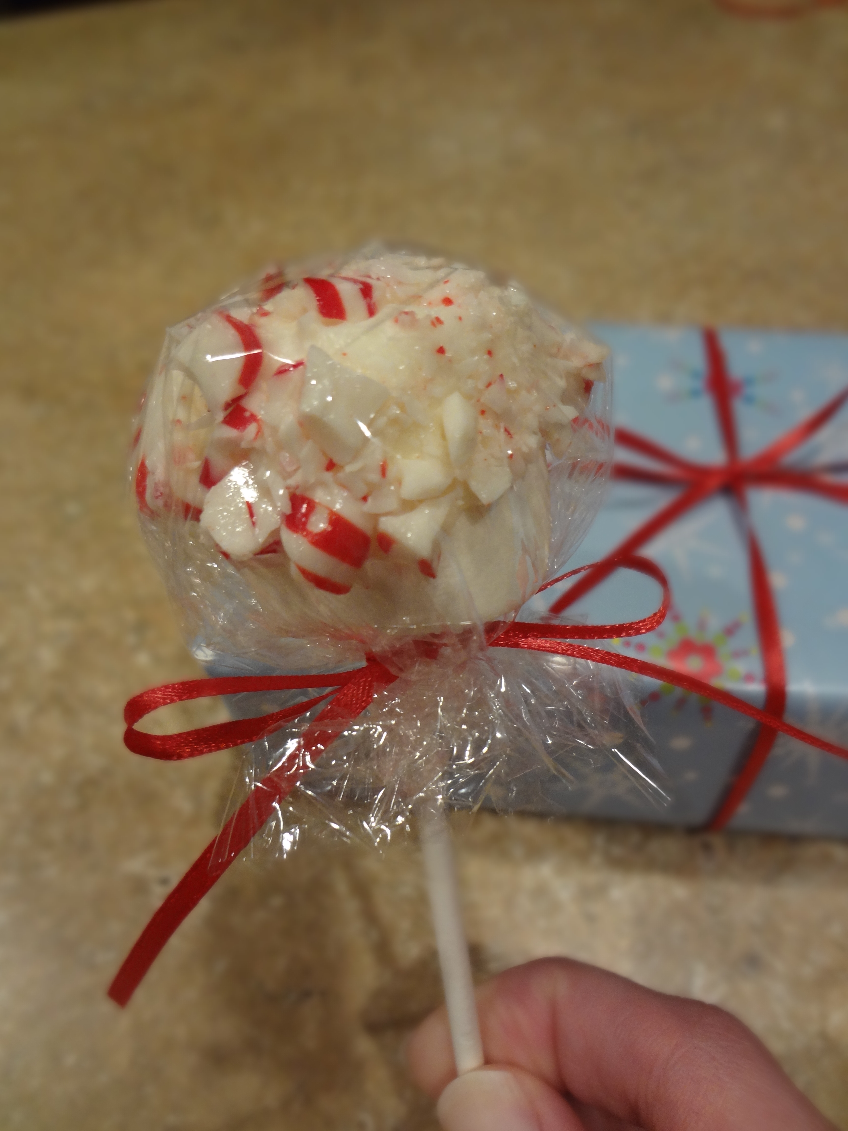and tied it close with red ribbon. There was some excess plastic wrap on the pop, so I cut around the pop so the wrap didn’t completely engulf the stick. Tying the ribbon into the bow was the final touch. I knew I needed a creative way to display these pops so I purchased some foam from my local craft store – the kind that they use for floral arrangements. I wrapped the foam like a present and then pushed the sticks through the wrapping paper into the foam. It’s really great for presentation as well as practical for transportation.